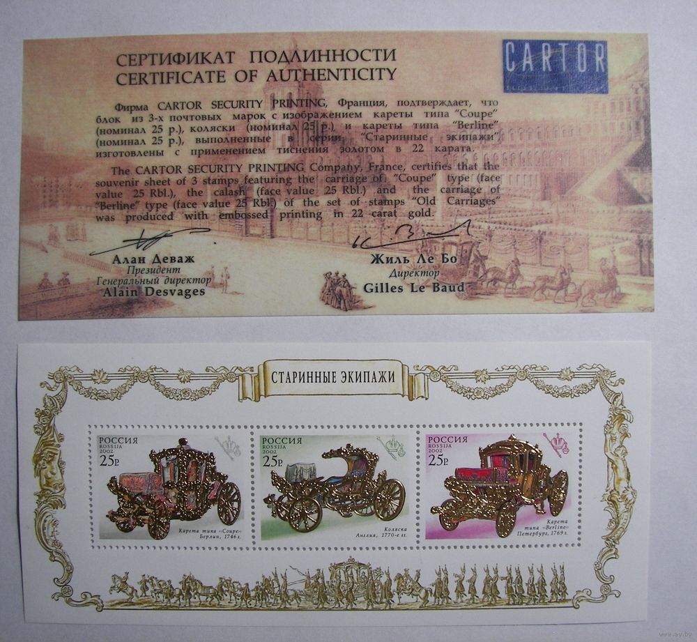 Старинные экипажи. Блок. Тиснение золотом. Сертификат. 2002г.