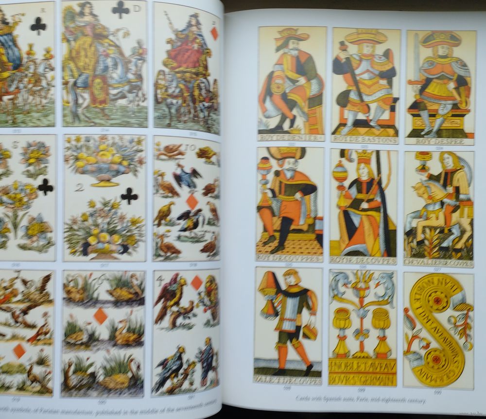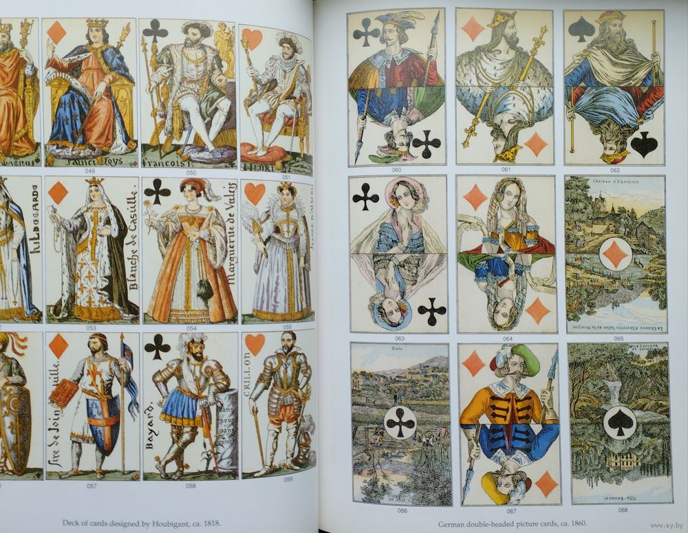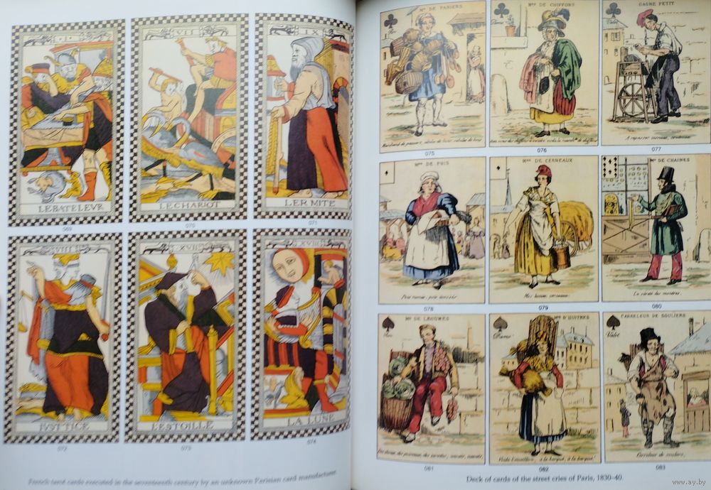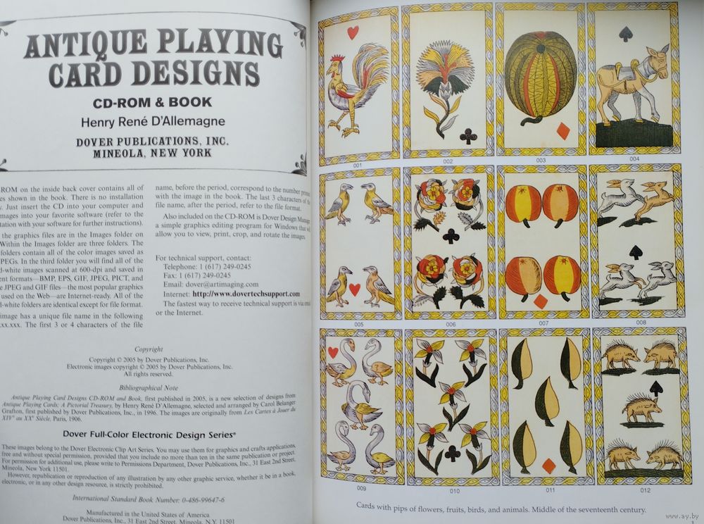 Отпечатано в США. Большой энциклопедический формат. Тираж 2000 экз. 248 стр. By Henry Rene D'Allemagne (Author). This striking treasury of playing cards, reproduced from designs used on cards between the fourteenth and early-twentieth centuries, includes nearly 500 images from a rare French volume. The elegant illustrations, approximately half of which are in full color, graced both European regular and tarot card decks and display such motifs as stylized versions of king, queen, and other face cards; musical instruments; fantasy figures; and wild fowl. The set includes: One CD-ROM containing 496 high-quality, permission-free images?251 black-and-white images scanned at 600 dpi and saved in six different formats (TIFF, PICT, EPS, BMP, as well as Internet-ready JPEG and GIF) and 245 full-color images scanned at 300 dpi and saved in JPEG format. A large-format 48-page book with every image on the CD-ROM printed large and clearly and numbered for easy reference
