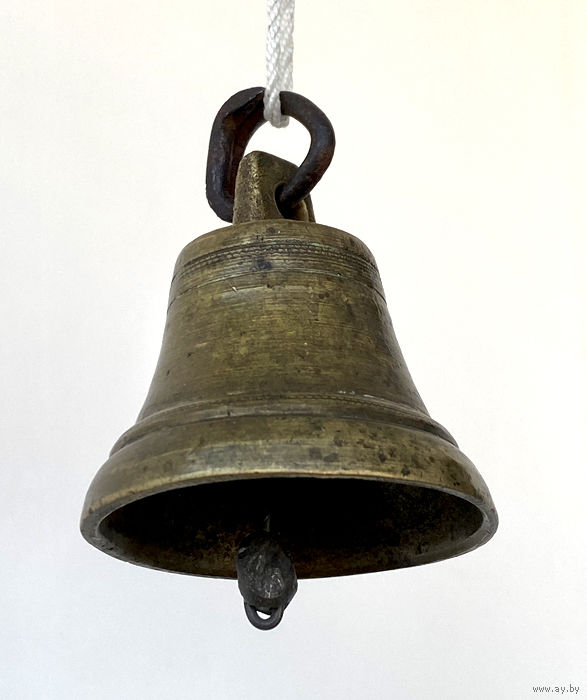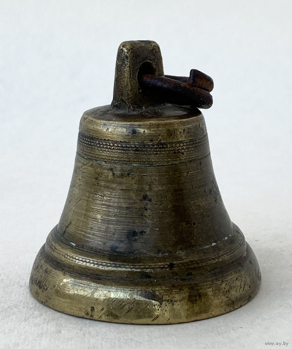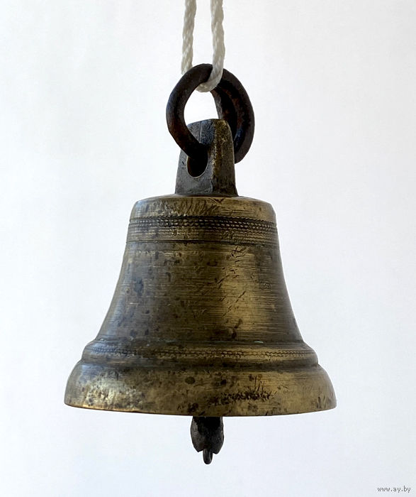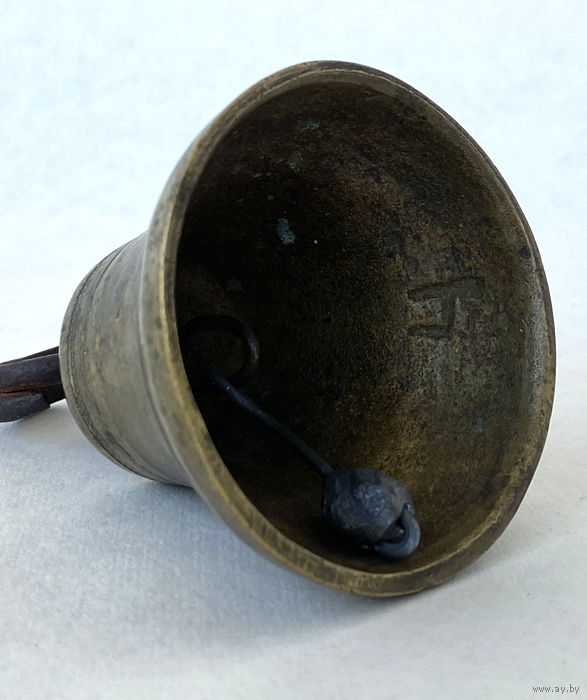 Старинный поддужный колокольчик № 4. Звонкий, с языком. Высота с петлёй 6 см, диаметр юбки 6 см. Внутри цифра "4". Состояние хорошее