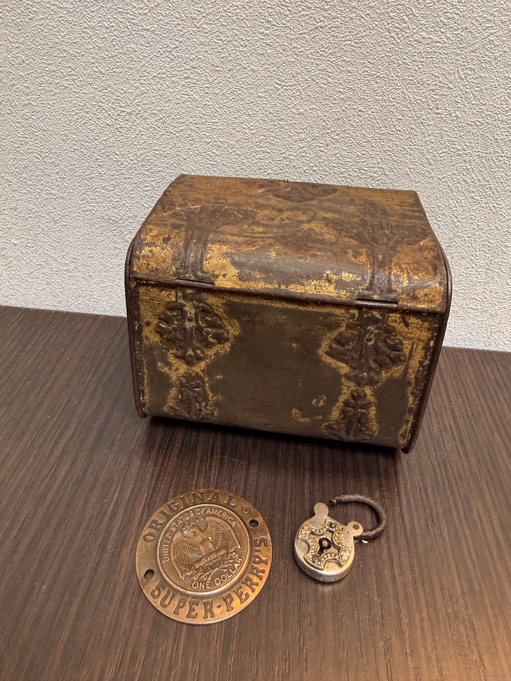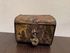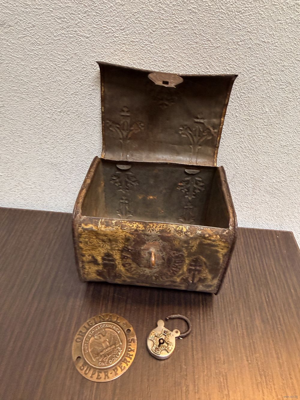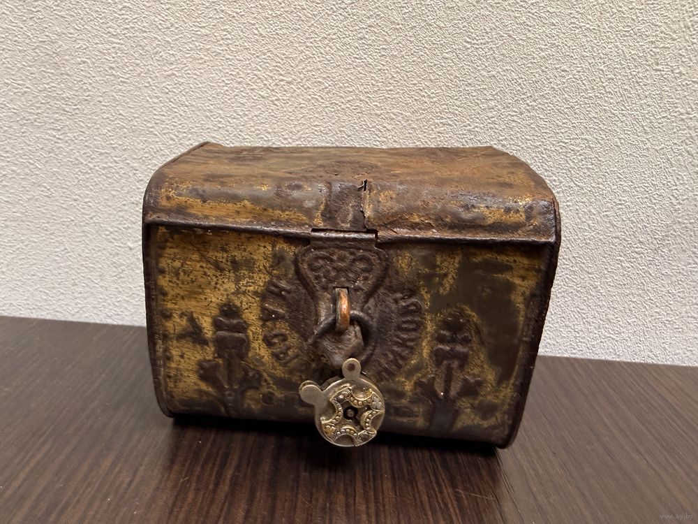 Старинный металлический сундучок (шкатулка) с навесным замком и декоративной пластиной.