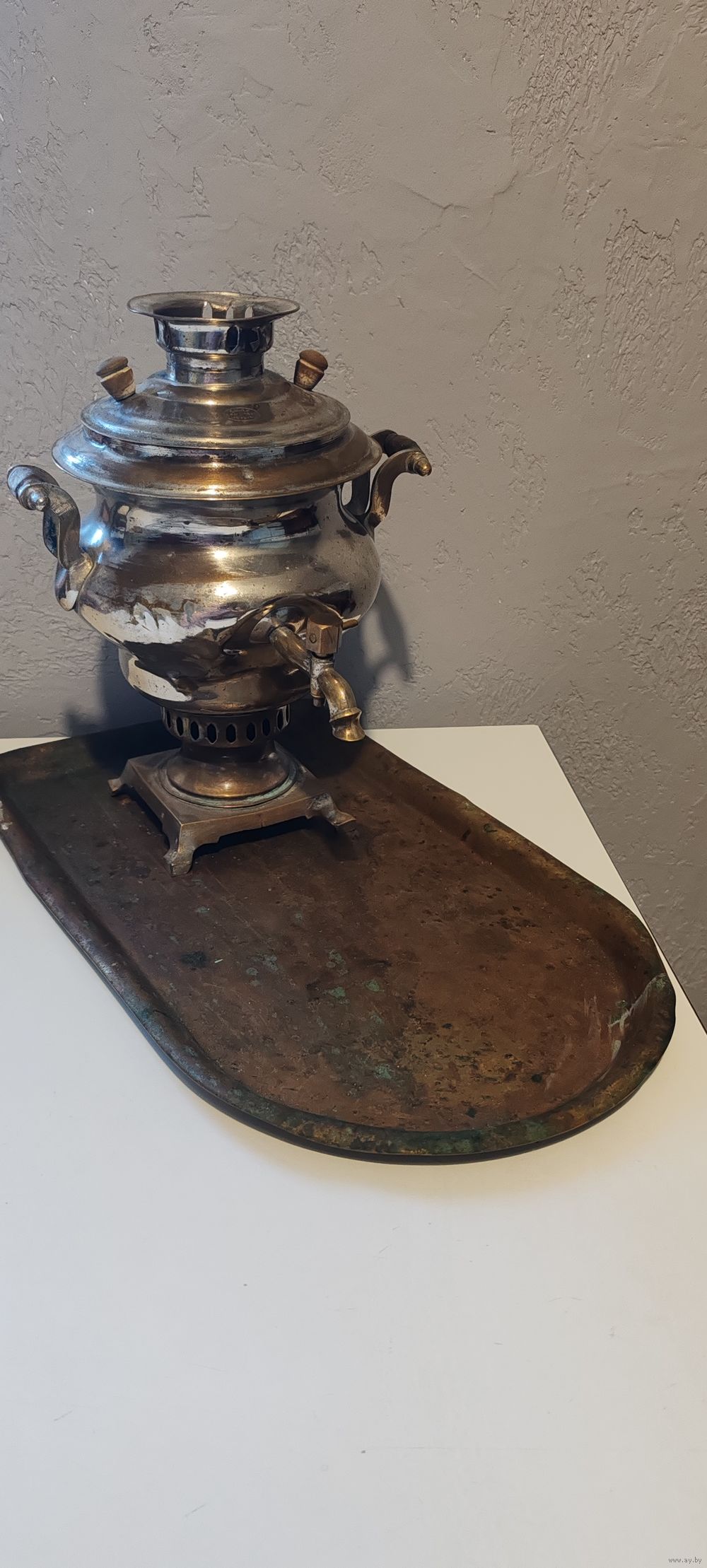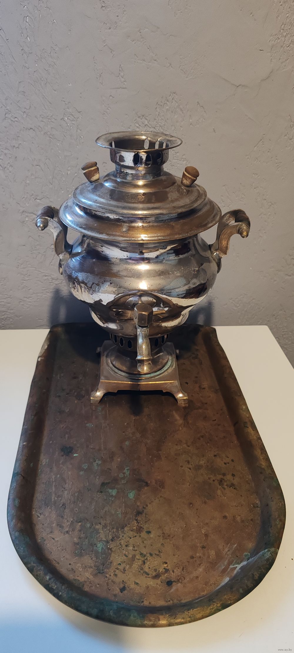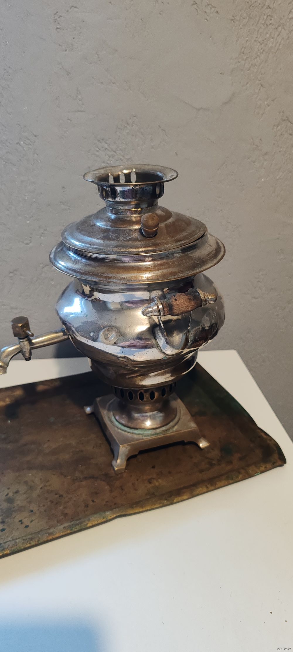 | Маленький самовар-эгоист на 1 литр. В рабочем состоянии. Краник самодельный. Присутствуют незначительные вмятинки. Поднос латунный, без клейм | |