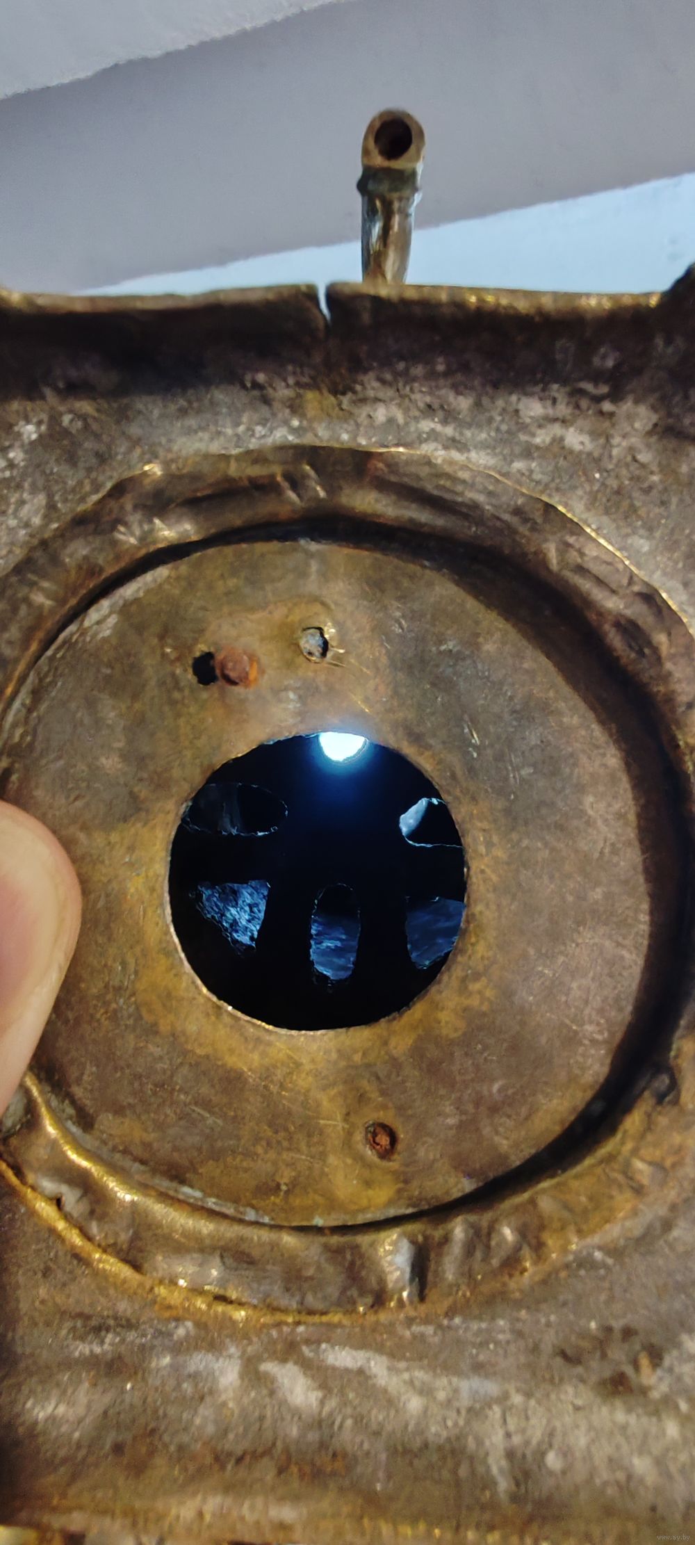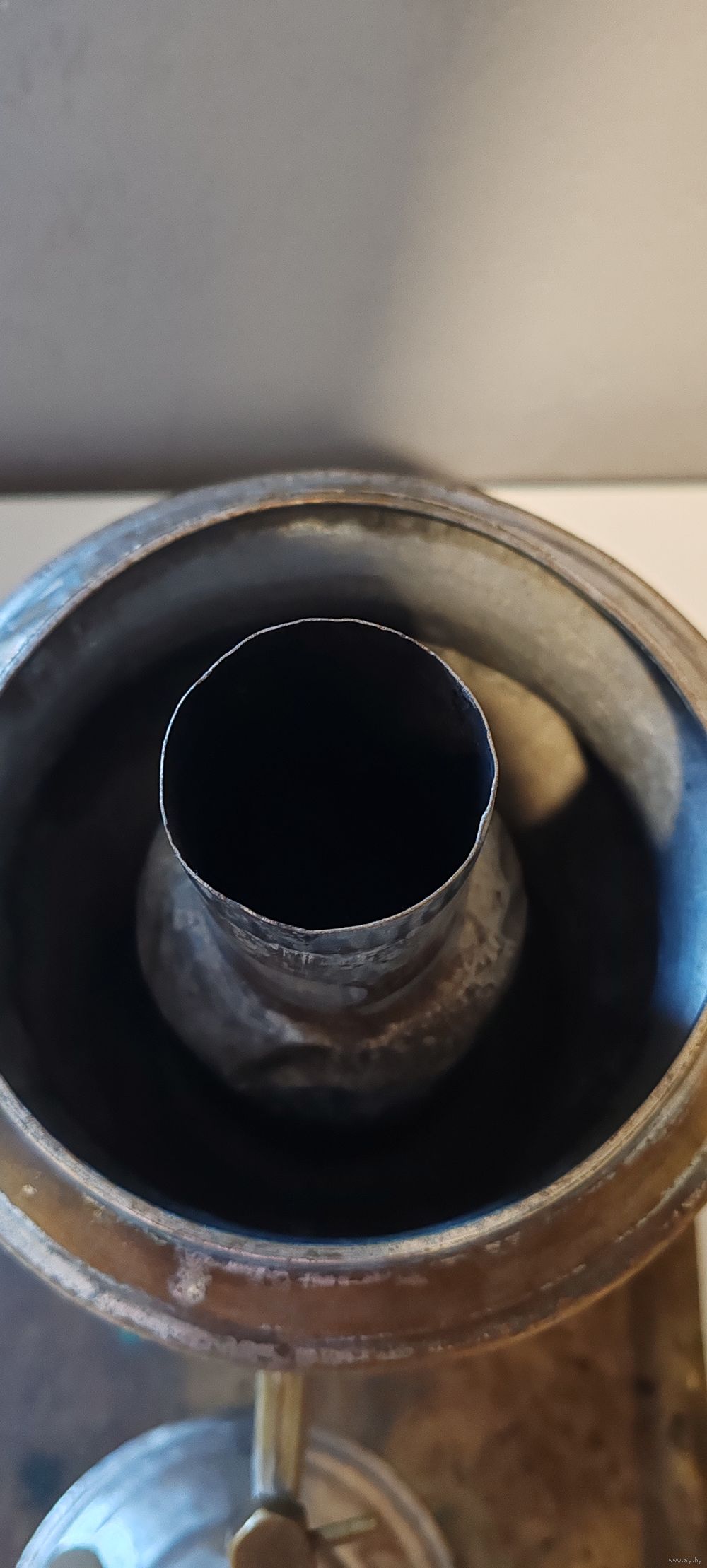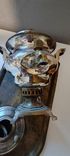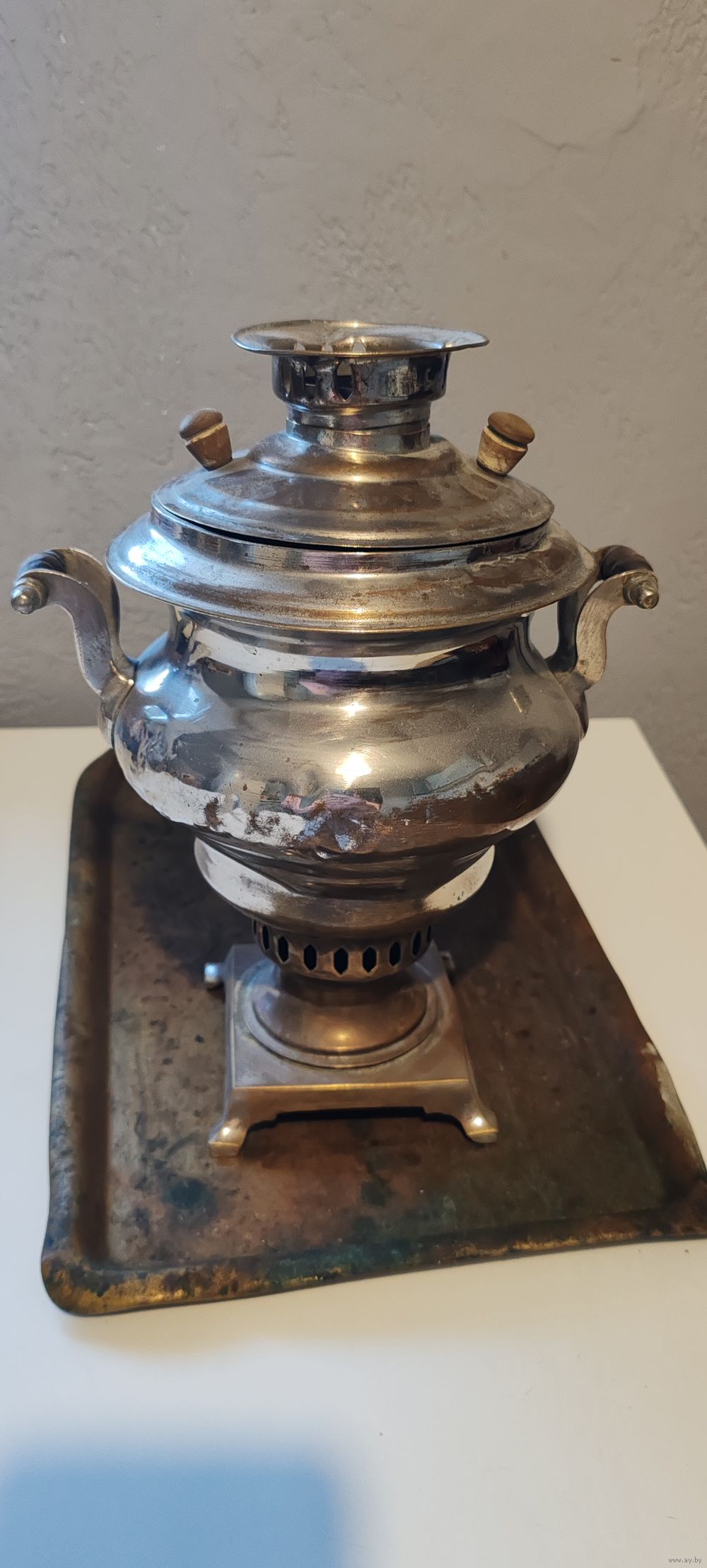 | Маленький самовар-эгоист на 1 литр. В рабочем состоянии. Краник самодельный. Присутствуют незначительные вмятинки. Поднос латунный, без клейм | |