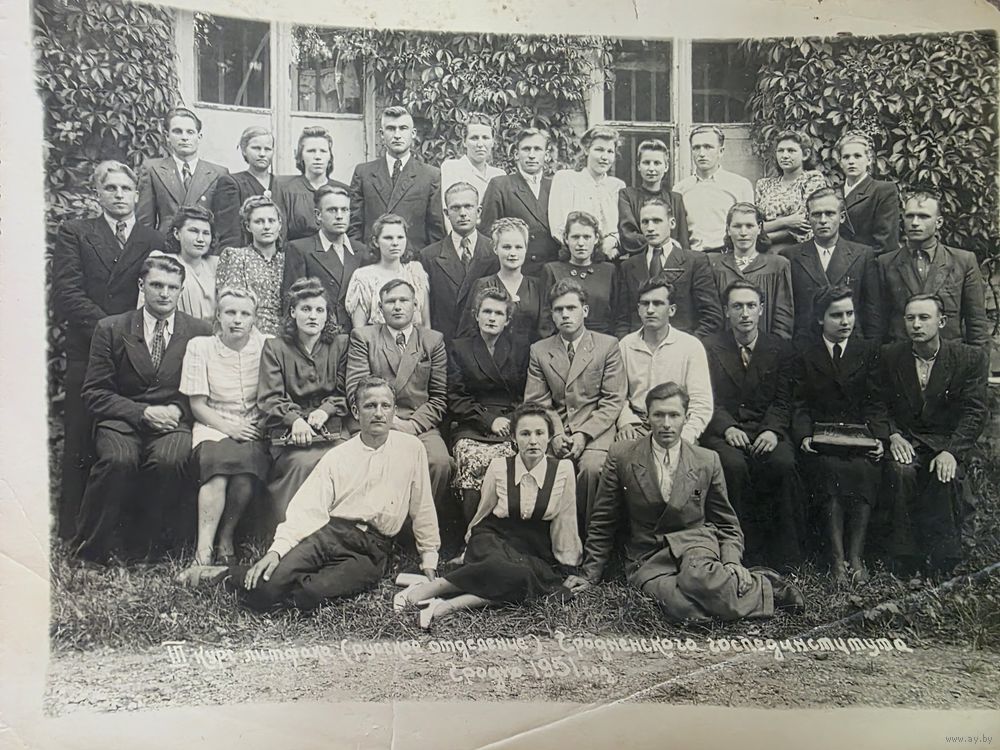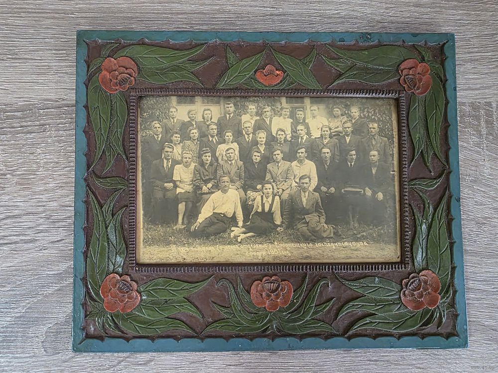 Рамка-дерево, резьба 25×20,8 см, фото 18×13,2 см. III курс литфака(русское отделение) Гродненского госпединститута . Гродно 1951 г.