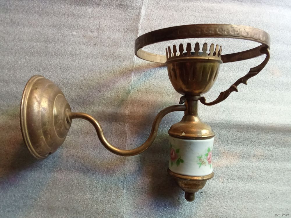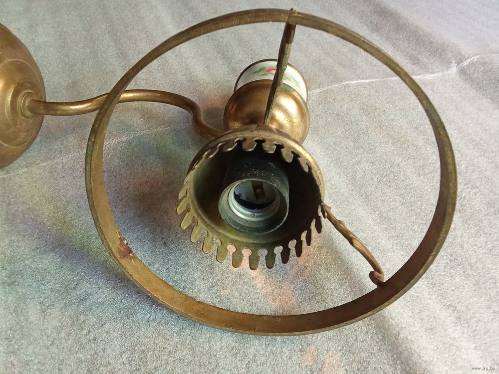 Старое латунное бра под реставрацию или на запчасти. Утрачен декоративный элемент между основанием и кольцом абажура. Состояние вполне приемлемое.