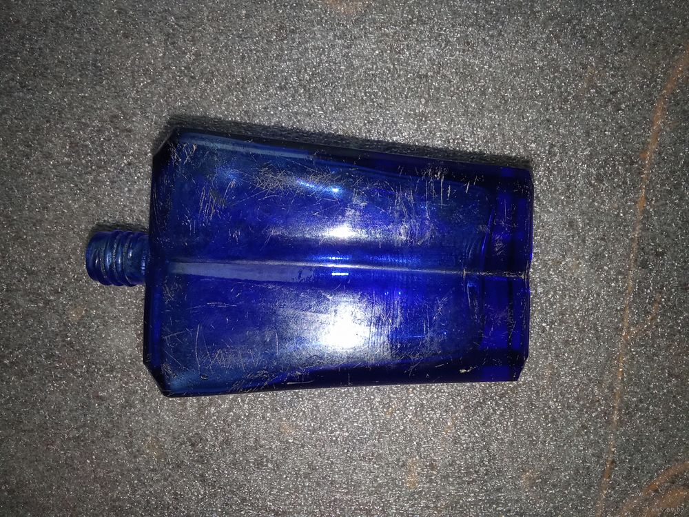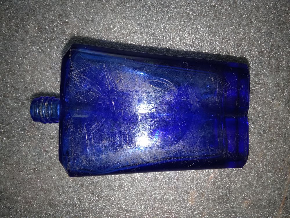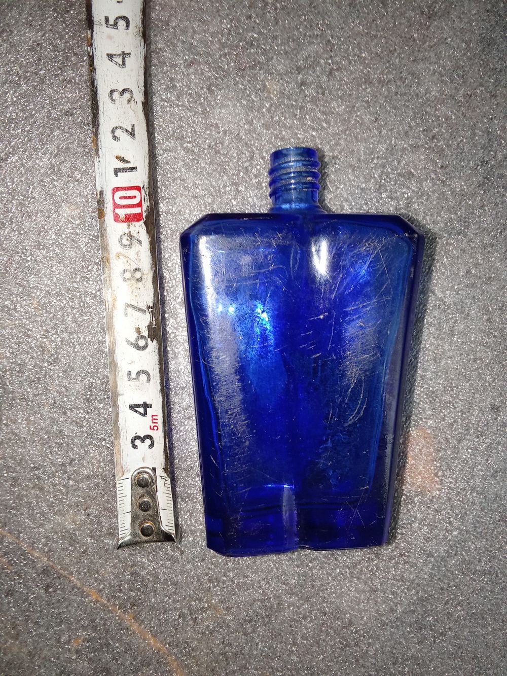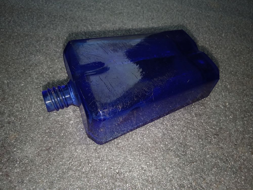 Старый флакон от парфюма, синее стекло. Потёртости от времени, сколов нет. Состояние вполне приемлемое.