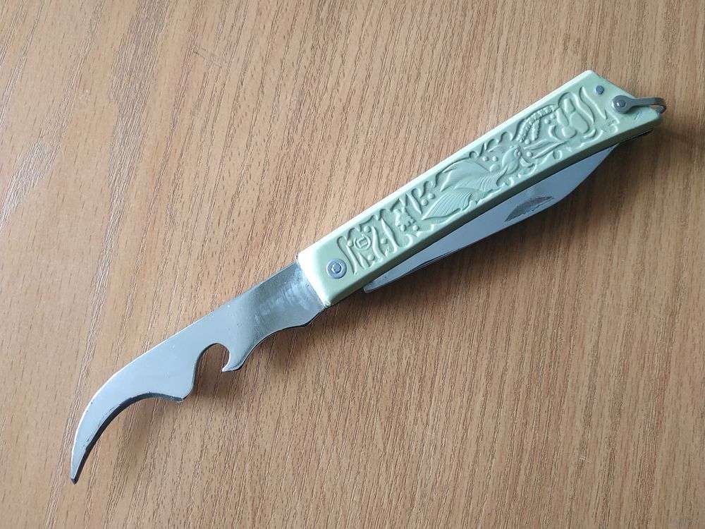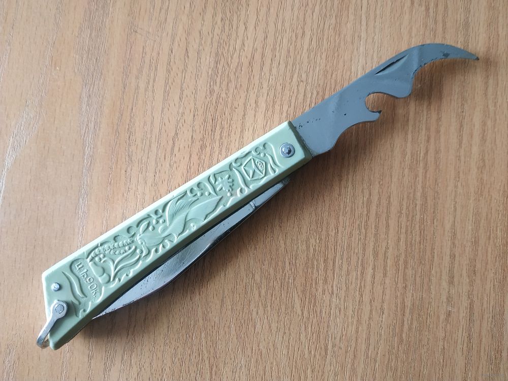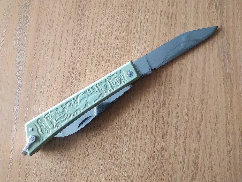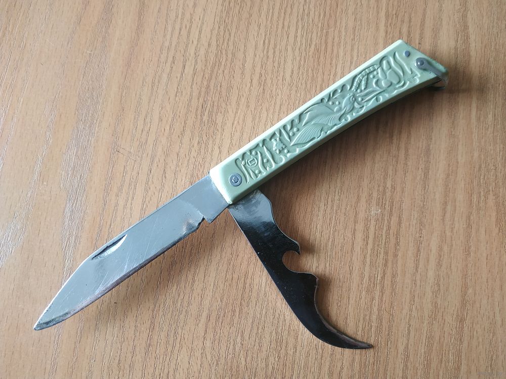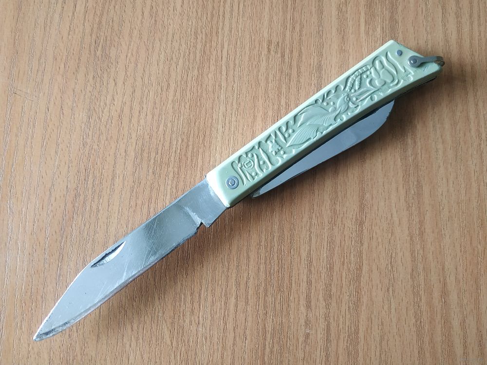 Отличный карманный складной туристический нож. 2-х предметный. Общая длина ножа в раскрытом положении - 222 мм , в закрытом положении - 123 мм . Длина клинка - 99 мм . Ширина клинка - 18 мм . Толщина клинка - 2,0 мм . Клинок не люфтит, фиксируется отлично и в раскрытом и в закрытом положениях. Материал изготовления накладок - пластик.