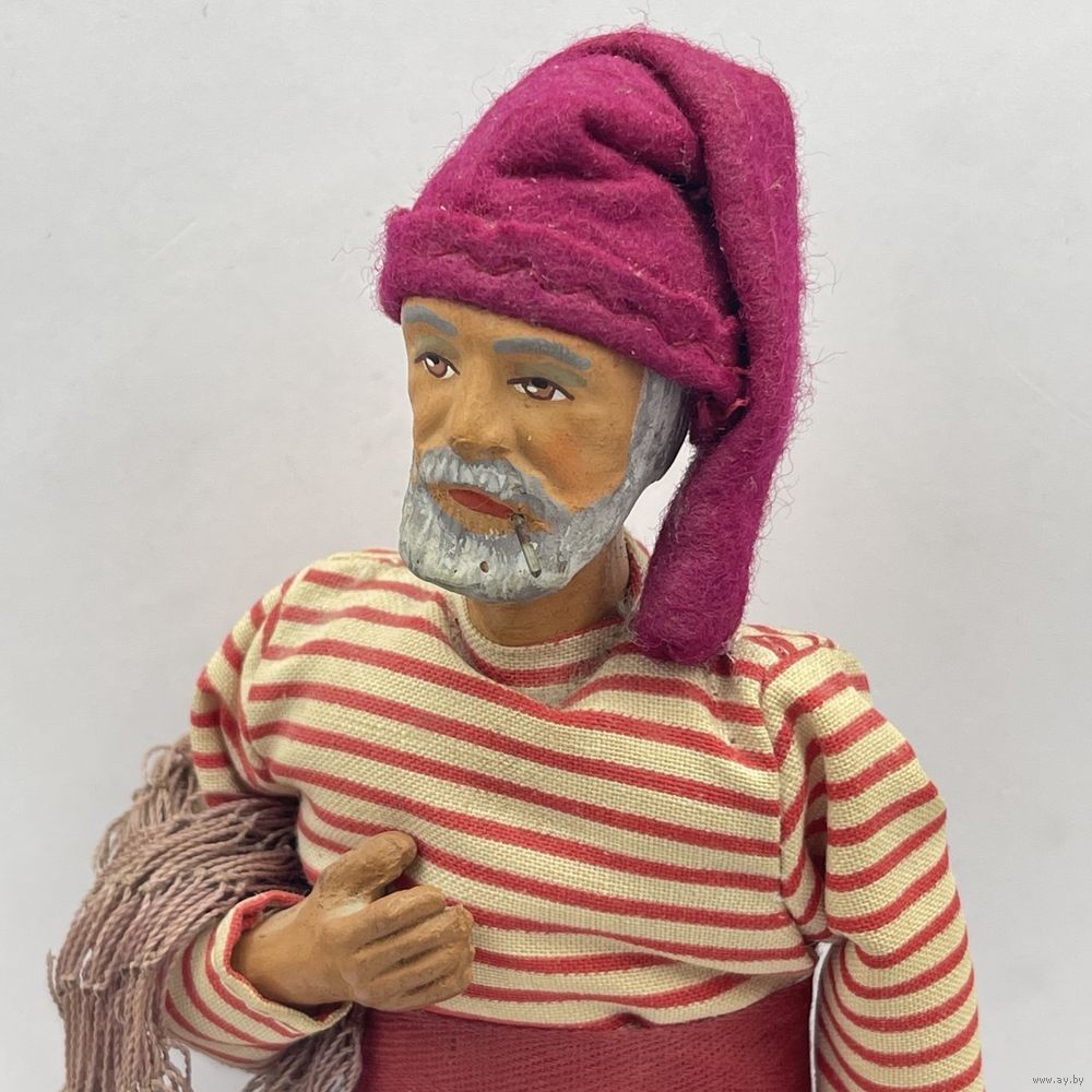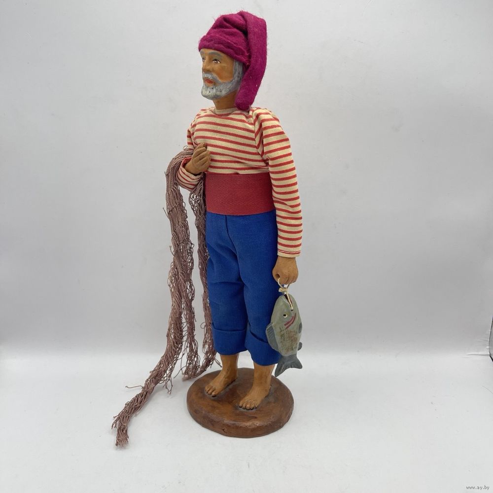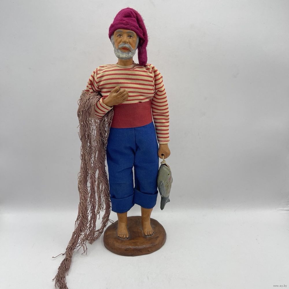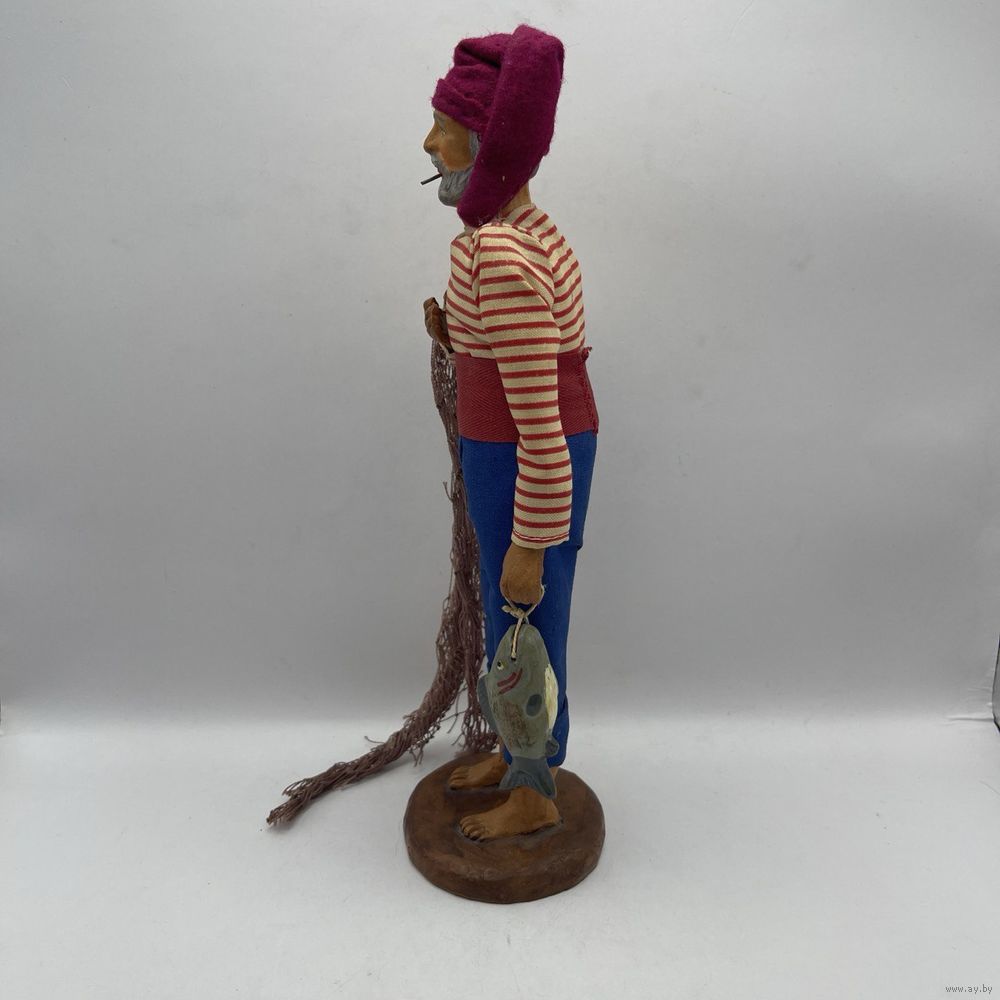 Антикварная статуэтка полностью ручной работы, глиняная фигура рыбака с сетью и уловом. Скульптура выполнена с соблюдением мельчайших деталей в выражении лица, сигарете в уголке рта, одежде ручной работы. Руки подвижные. Глиняная рыба расписана вручную. Франция. 1930-е г.г. Клеймо в тесте. Высота 25 см.