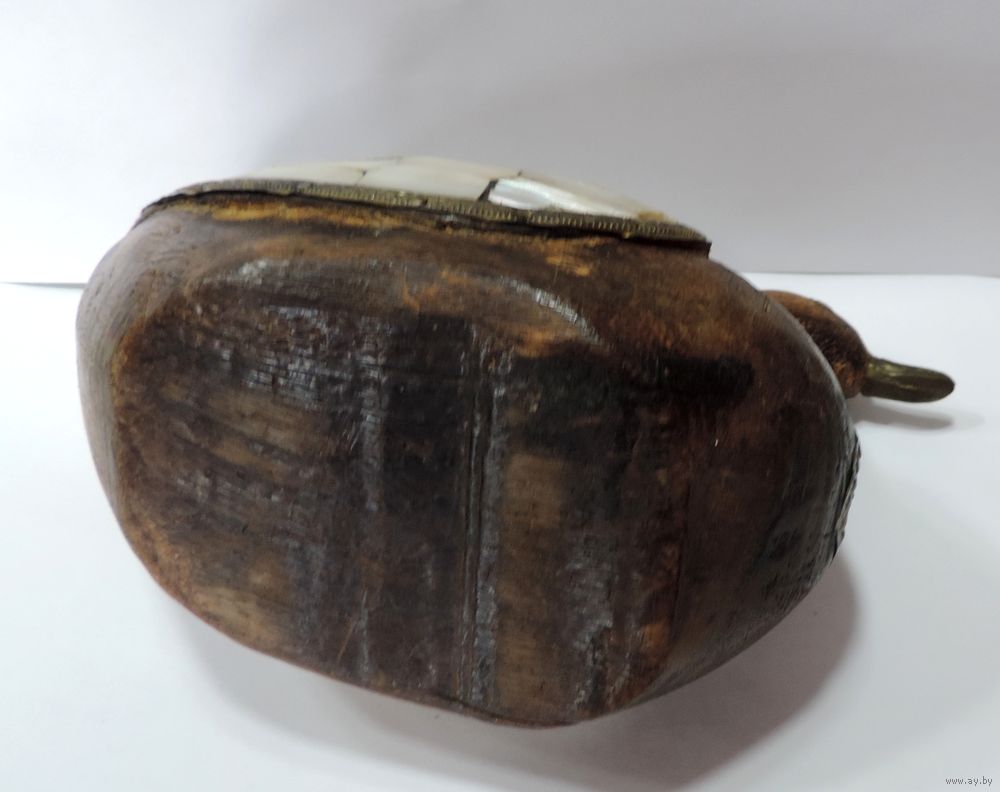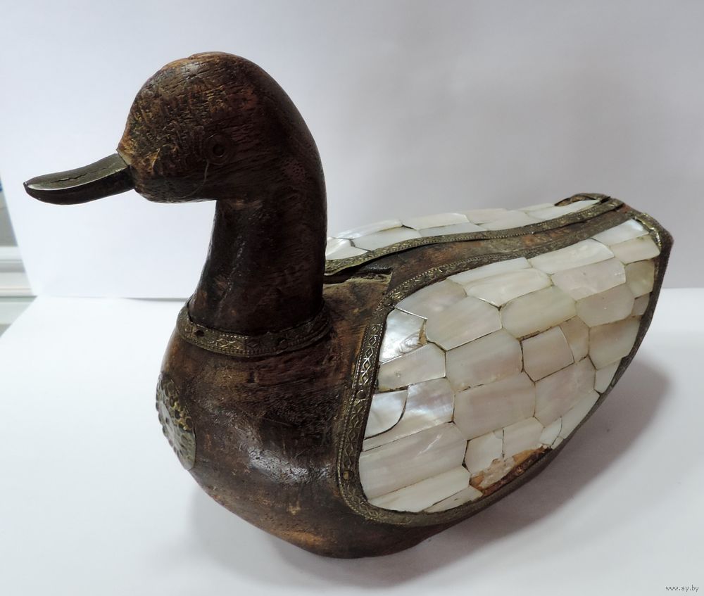 Статуэтка из дерева "Утка" 50-60-е годы. Высота 13 см. Длина 16 см. Перламутр, латунь.