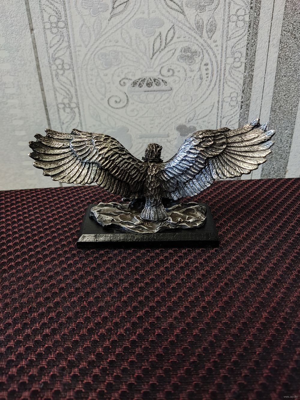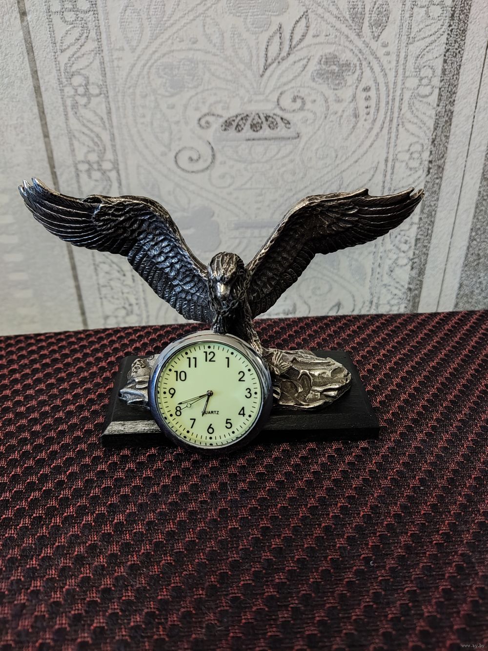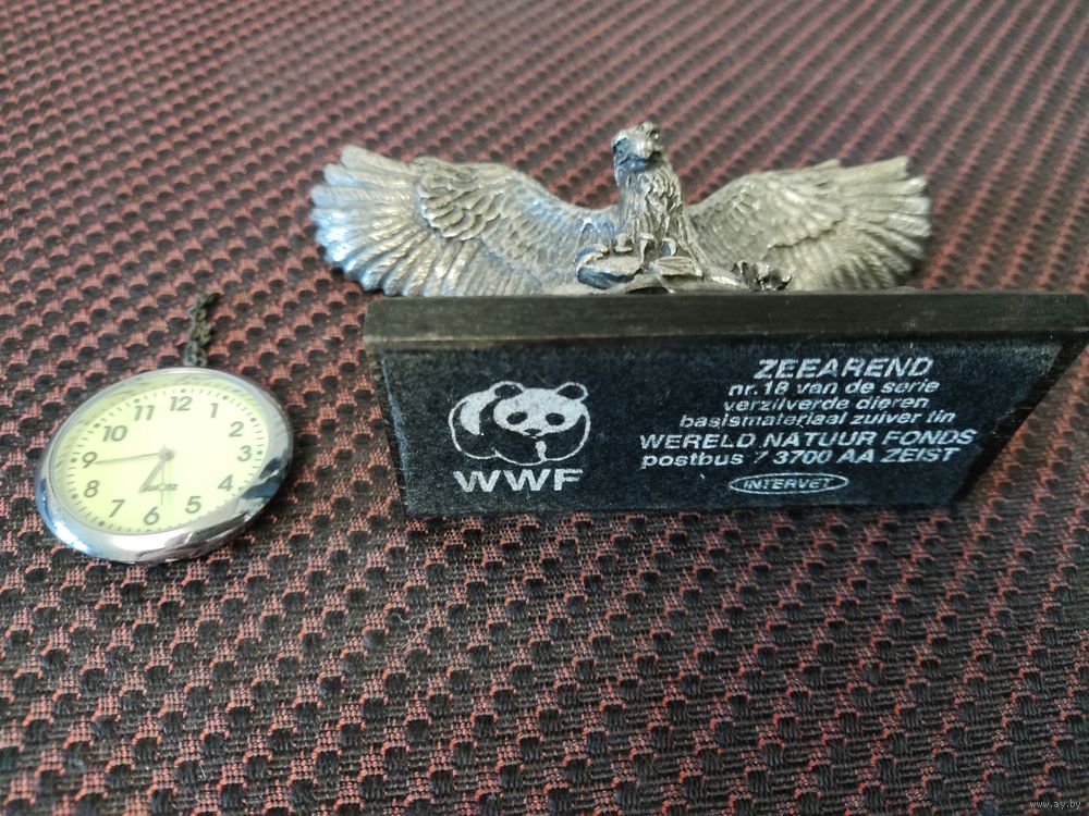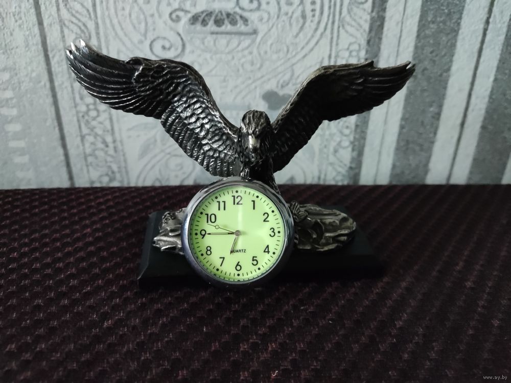 Статуэтка Орел с кварцевыми часами, б/у. Германия. Шпиатр. Размеры 13,8 х 4,5 х 8 (h) см. Часы новые диам. 3,8 см, точный ход. Циферблат часов флюоресцентный (светится). Отличный подарок!