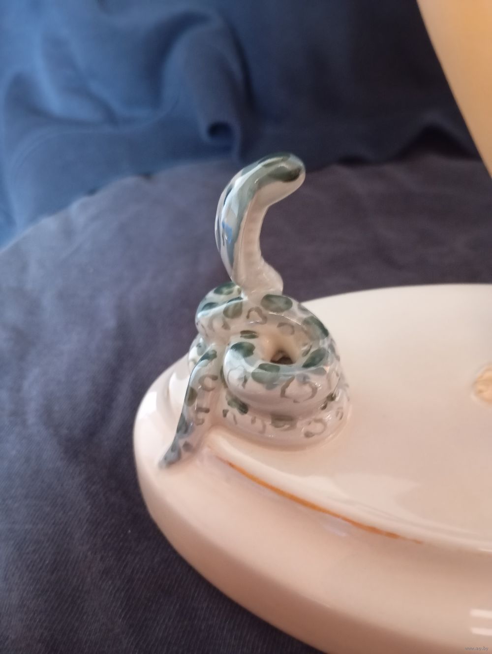 На левой руке и правой ноге есть темные пятнышки и на основании местами стёрт золотой обод (2 последних фото).