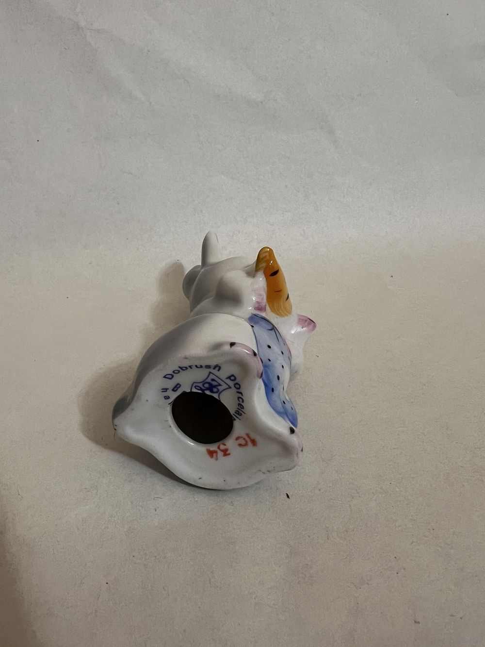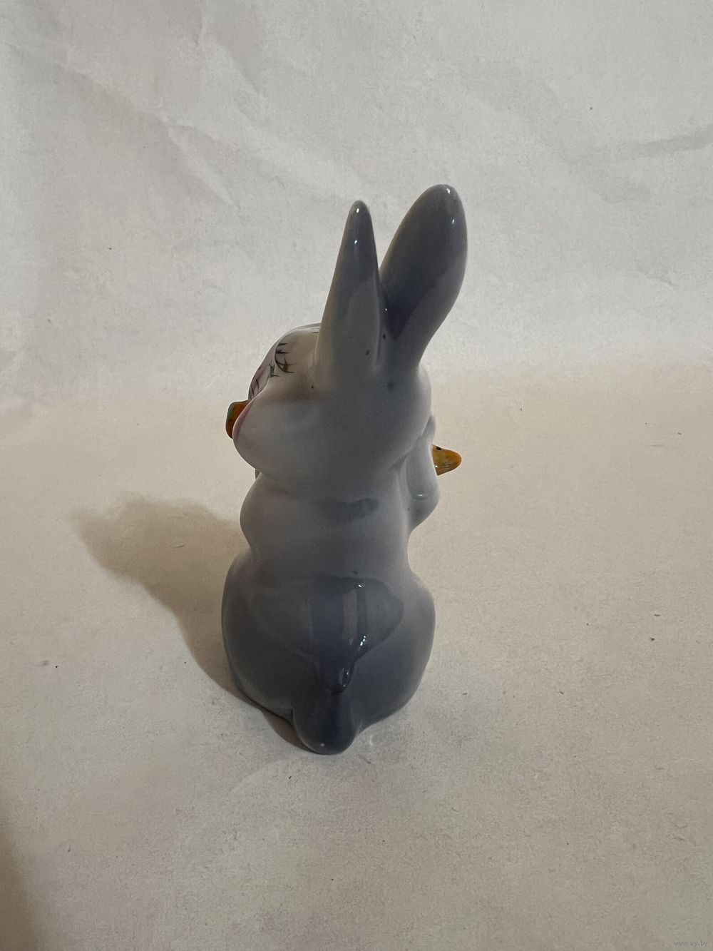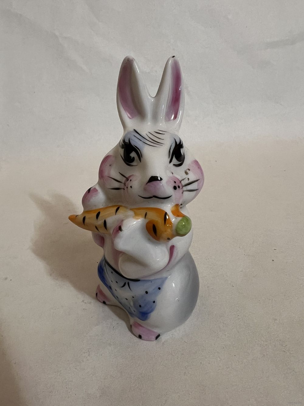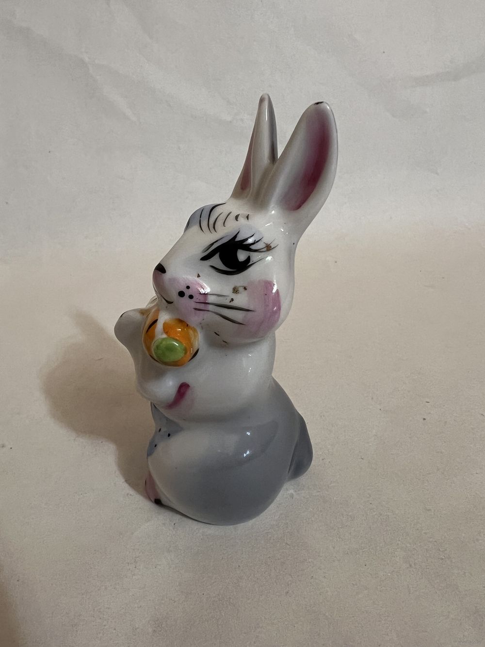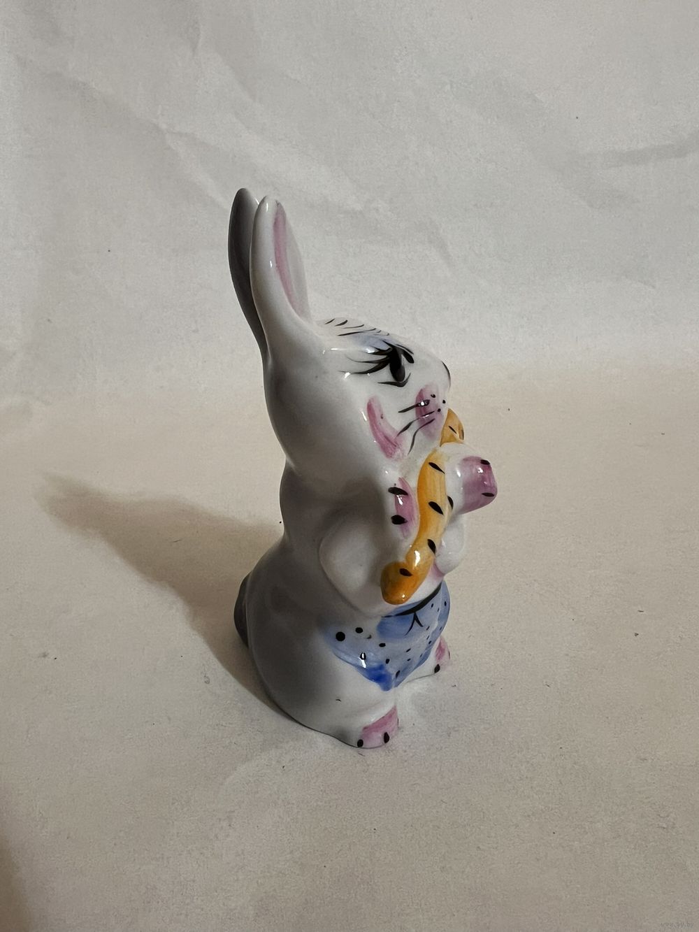 Фарфоровая статуэтка "Заяц с морковкой", высота 10 см, производство Добрушский Фарфоровый Завод (ДФЗ). Продавец не является экспертом, после выигрышной ставки вы получите предмет, изображенный на фотографии. Делая ставку вы принимаете условия продажи лота, установленные продавцом. Пересылку оплачивает покупатель.