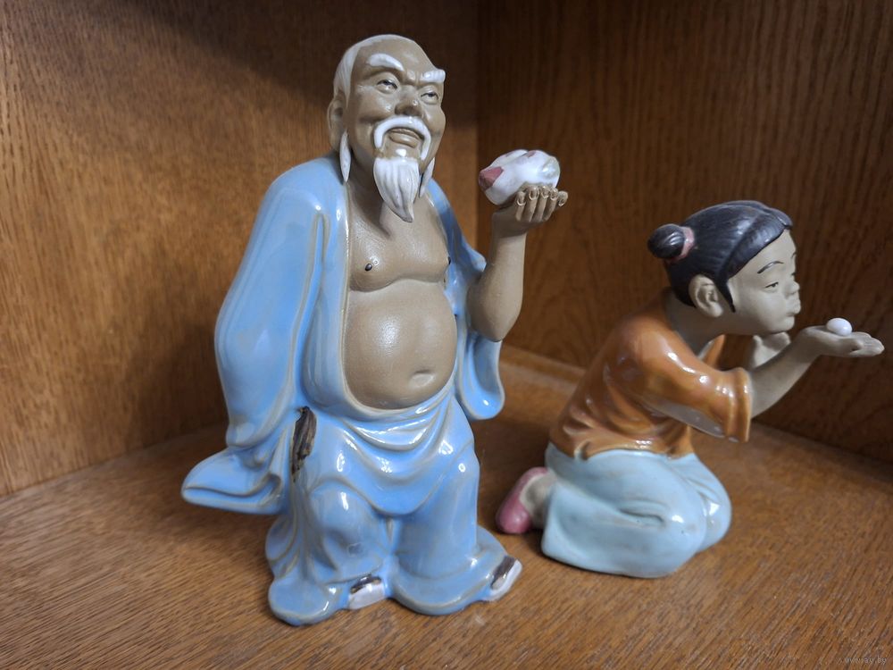 Статуэтки в идеальнейшем состоянии ,статуэтки представляют собой образ китайского мудреца бога долголетия Шоу-сина) с ребенком, Статуэтки изображают пожилого бородатого мудреца, , и ребенка, ловящего маленькую жемчужину .