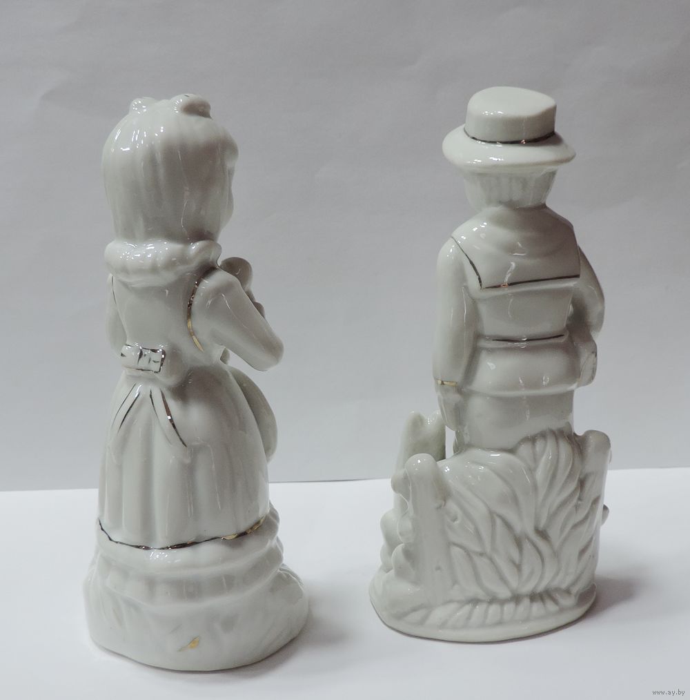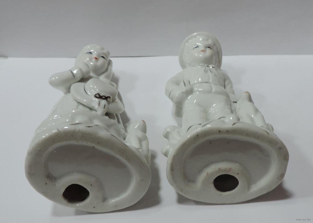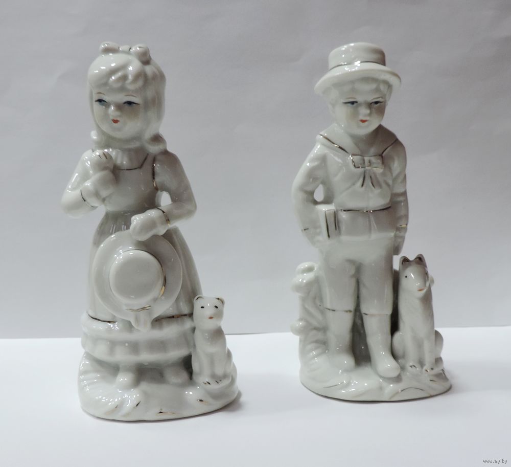 Статуэтки фарфоровые "Девочка с котом и мальчик с собакой" 80-90-е годы Европа. Высота 13.5 см. Целые, без реставрации.