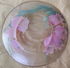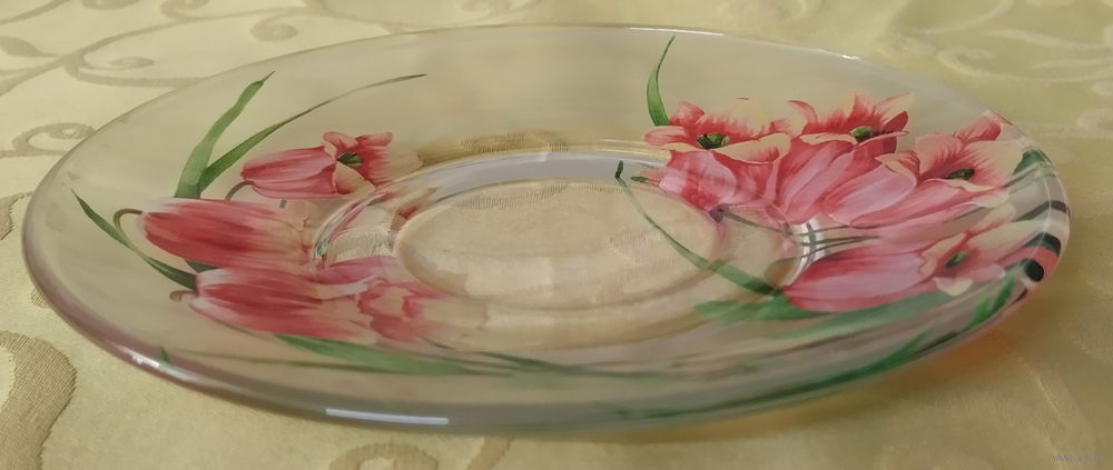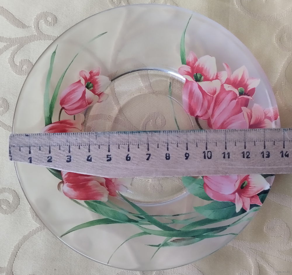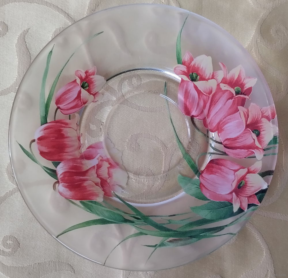 Стеклянное блюдце с изображением розовых цветов, похожее на продукцию бренда Luminarc.