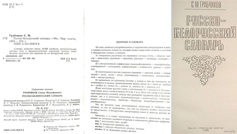 1.Русско-белорусский словарь, включает около 16000 наиболее употребительных слов и фразеологических сочетаний, которые могут вызвать трудности при переводе их на белорусский язык. Адресуется учащимся среднего и старшего школьного возраста