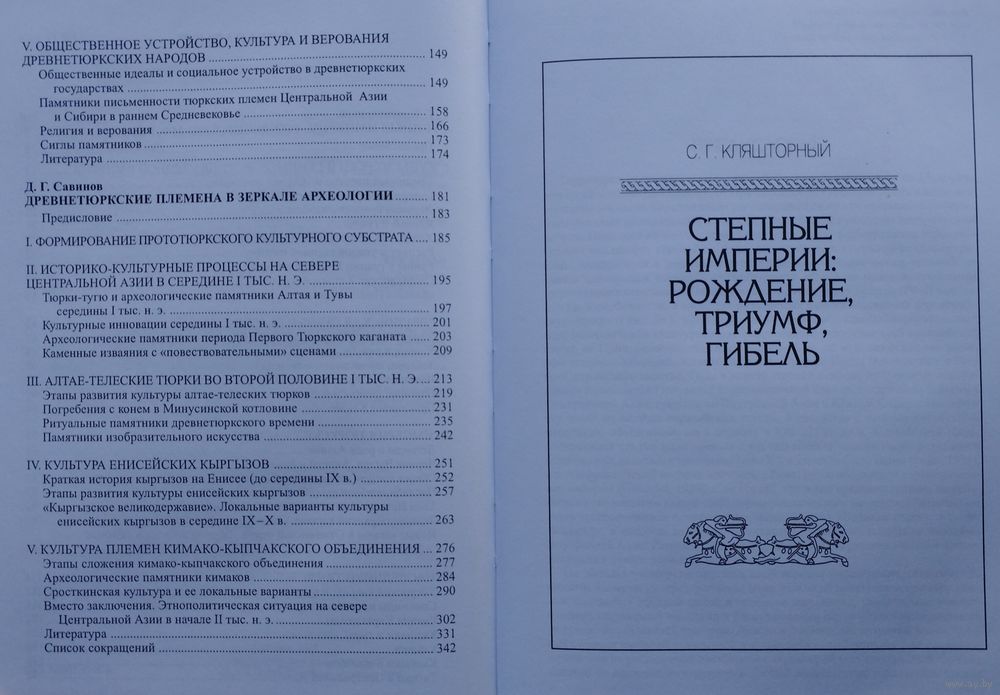Большой энциклопедический формат. Тираж 2000 экз. 350 стр. Иллюстрации. Книга историка-тюрколога С.Г. Кляшторного и профессора кафедры археологии Санкт-Петербургского государственного университета Д.Г. Савинова посвящена древней и раннесредневековой истории и культуре народов, населявших центрально-азиатский ареал евразийских степей, а также их западным миграциям в I тысячелетии нашей эры. Основное внимание авторы уделяют возникновению и истории первых степных империй, в недрах которых сформировались степные союзы, а затем и народы, говорившие в основном на тюркских и монгольских языках. Впервые подробно рассмотрено выявленное в ходе археологических исследований культурное наследие степных народов Центральной Азии и Южной Сибири.