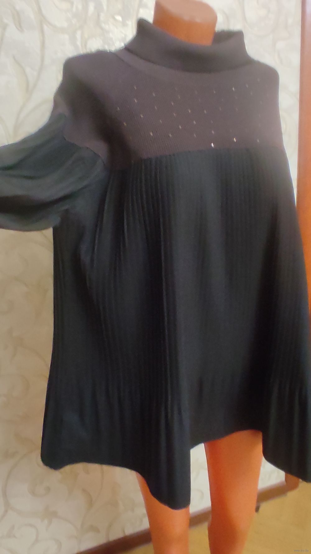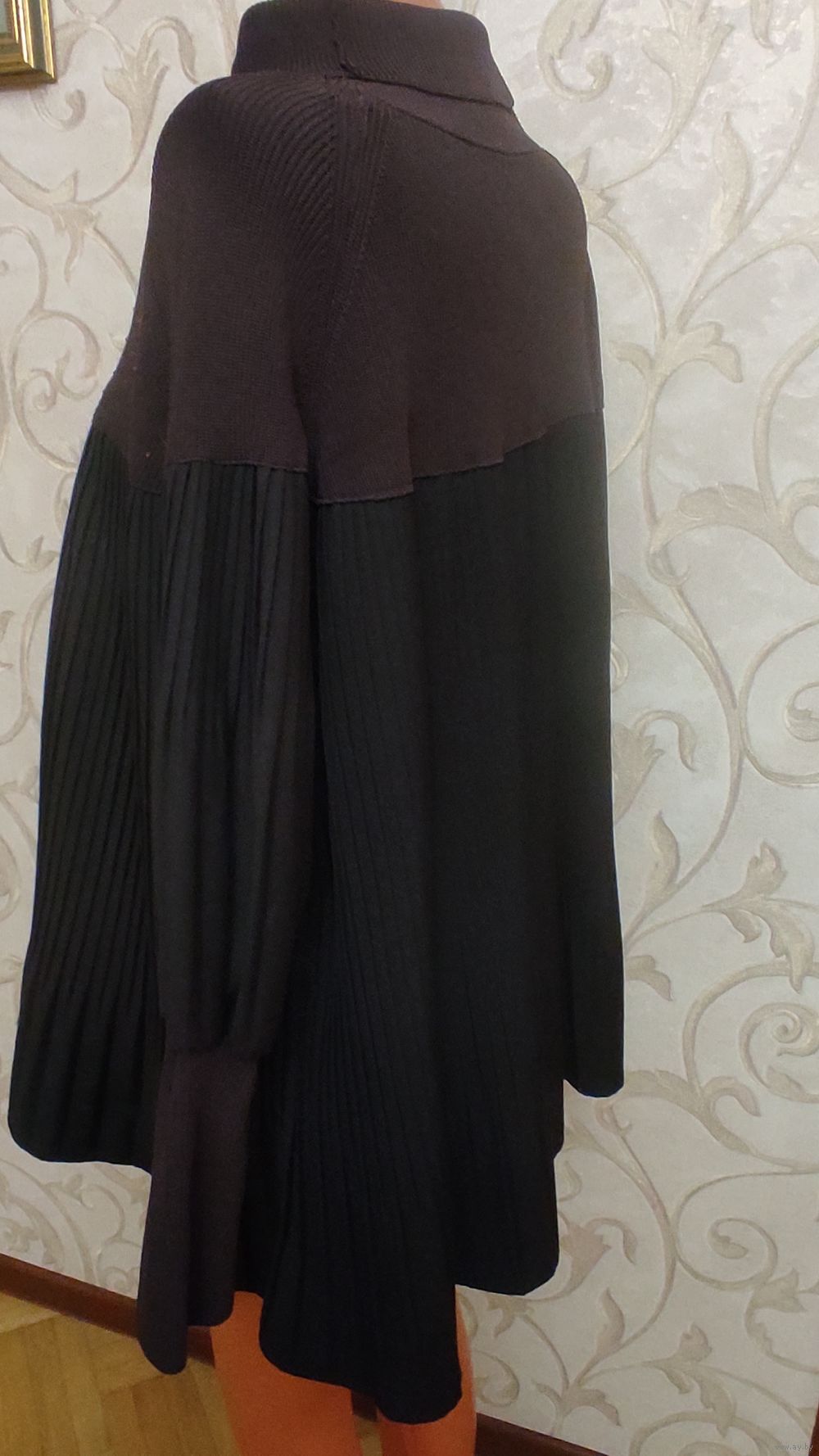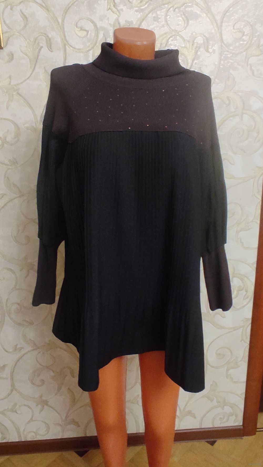 Стильный джемпер на 66-70 размер, шикарно сидит на фигуре, очень необычное. Яркая, скрывающая все "ненужные" детали. Замеры делать бесполезно, та как они будут неинформативны. Подойдет на 66-70 размер точно и на большую грудь. Цвет шоколадный. Длина 76 см. Хорошее состояние.