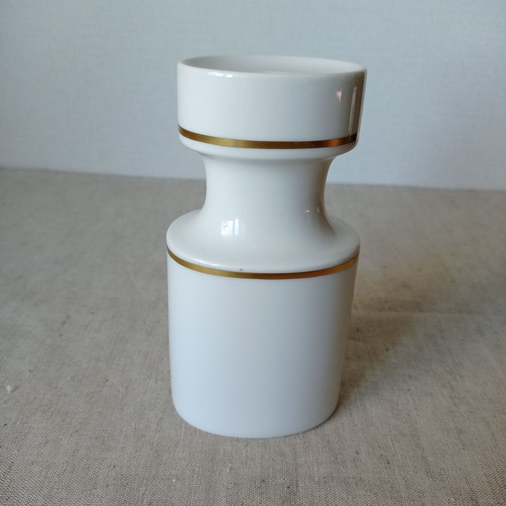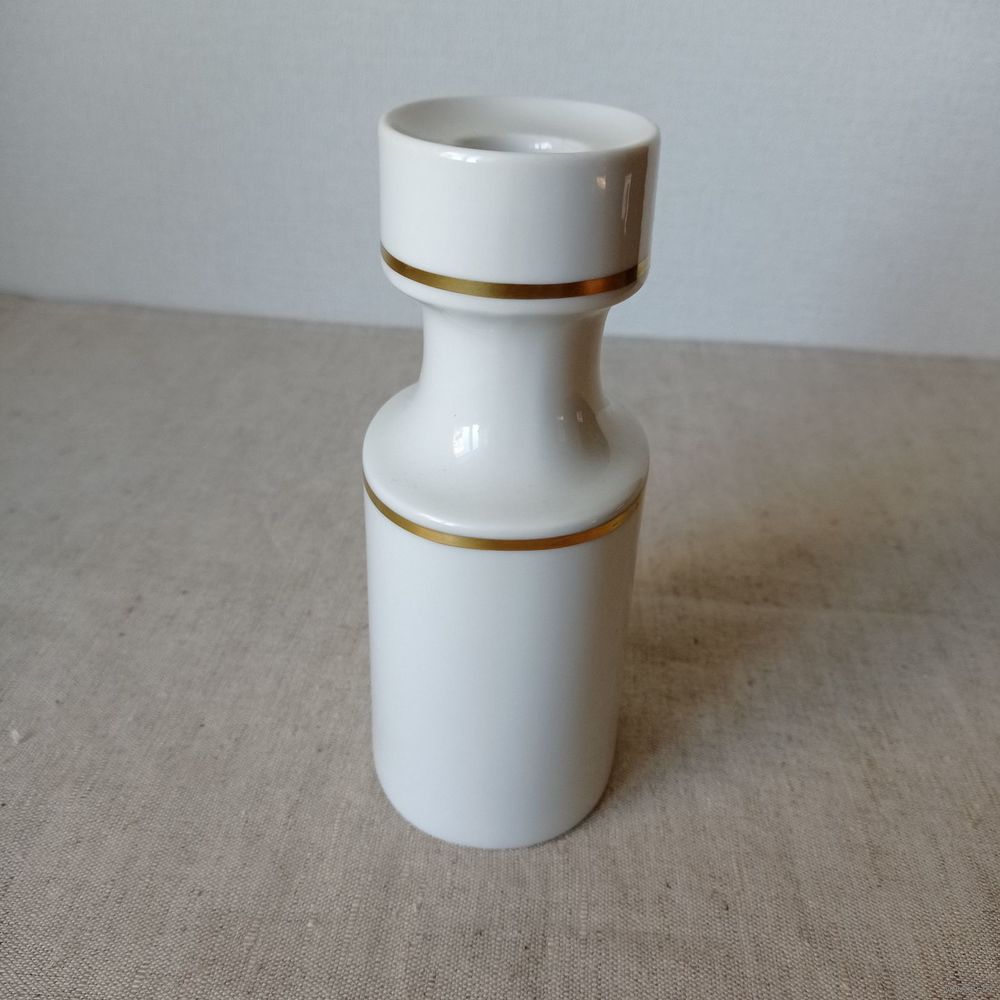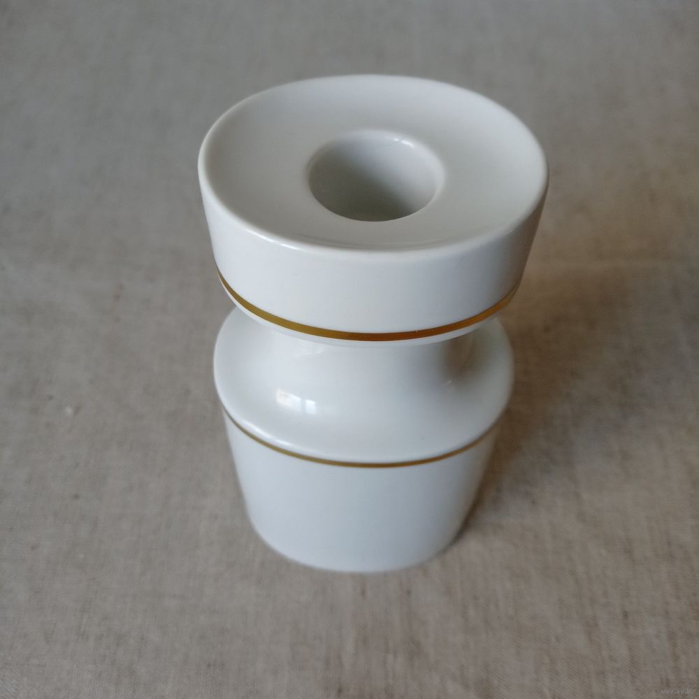 Подсвечник выполнен из белого глазурованного фарфора и декорирован тонкими золотыми полосками (золотым обрезом).