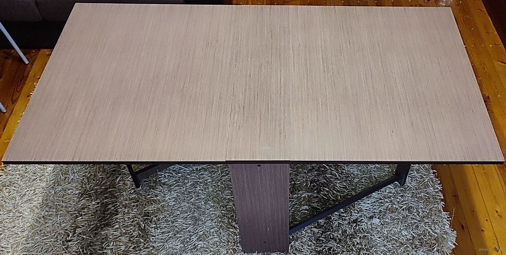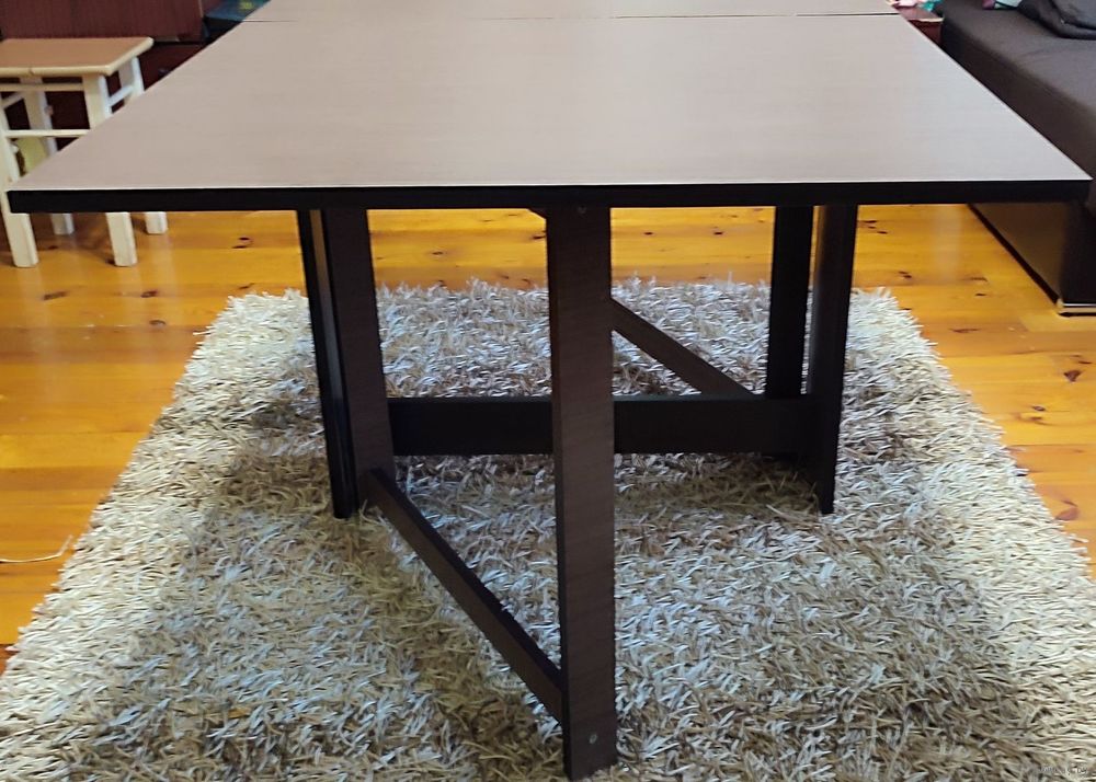 Стол-книга из ЛДСП. Небольшой, компактный столик в сложенном состоянии и полноценный стол для праздничного обеда из 8 человек в разложенном. Исправно справляется со своими функциями каждое семейное торжество. Фиксируется одной "ногой" по центру с каждой стороны
