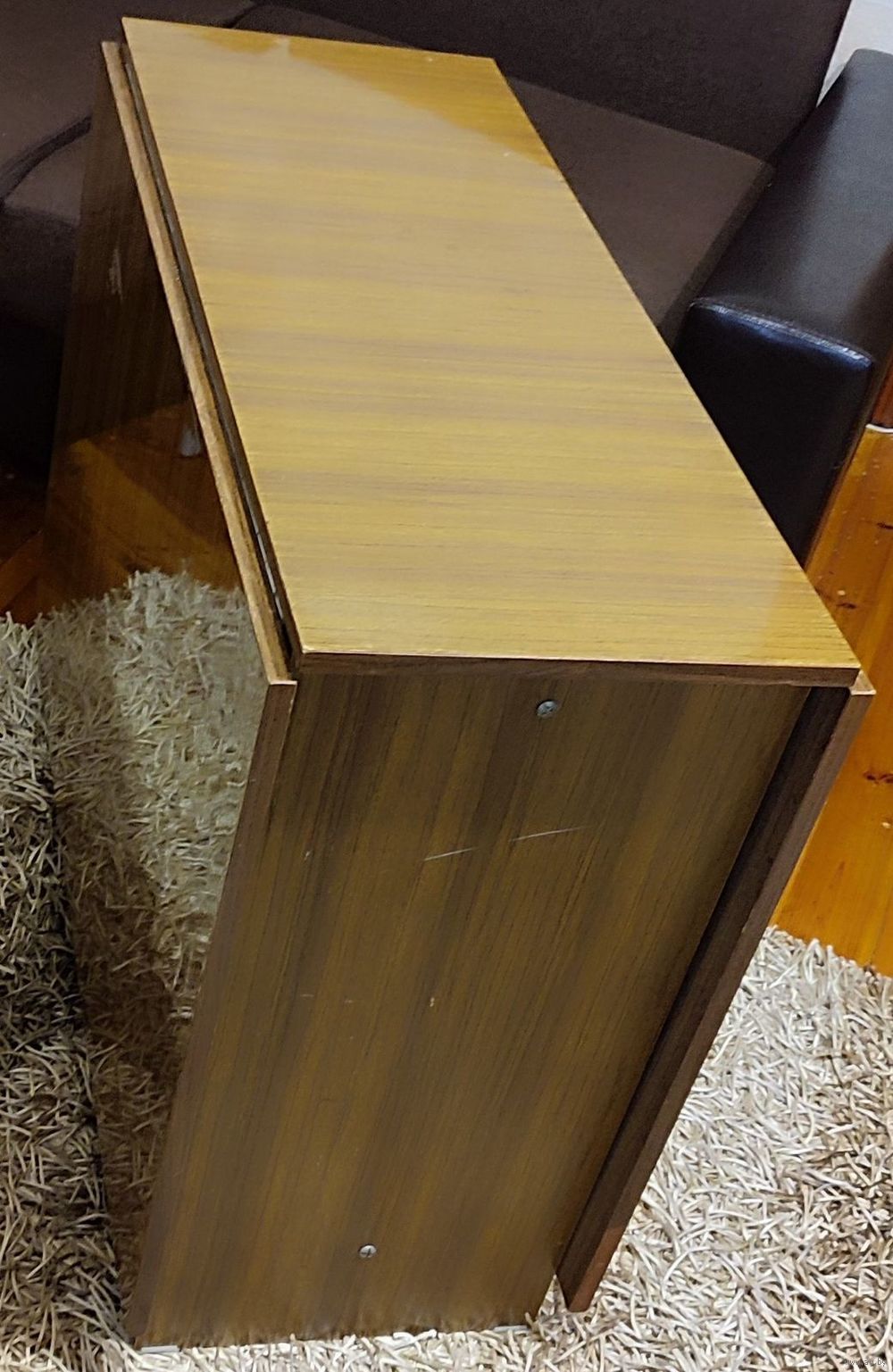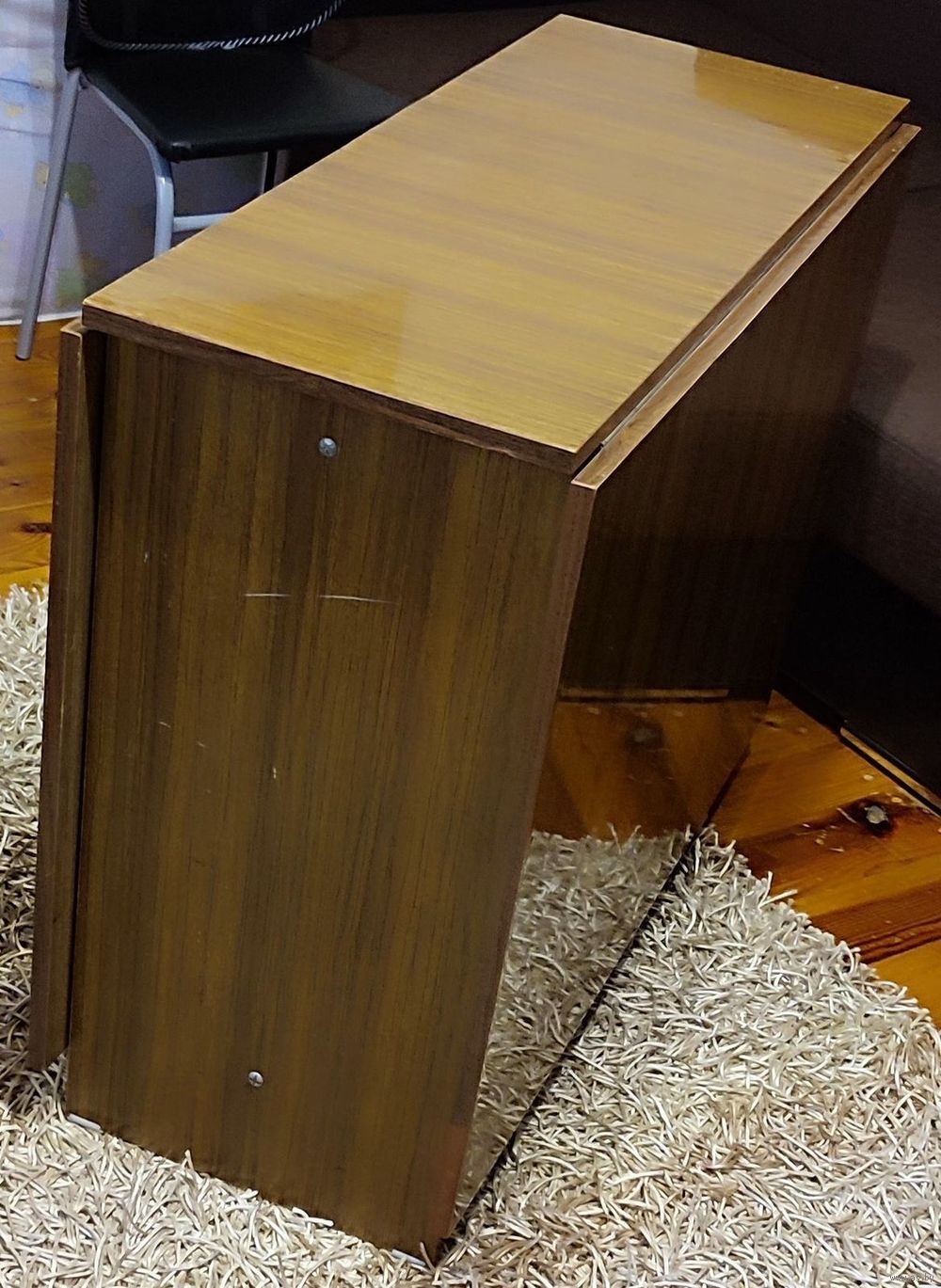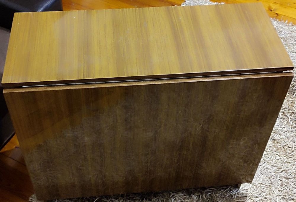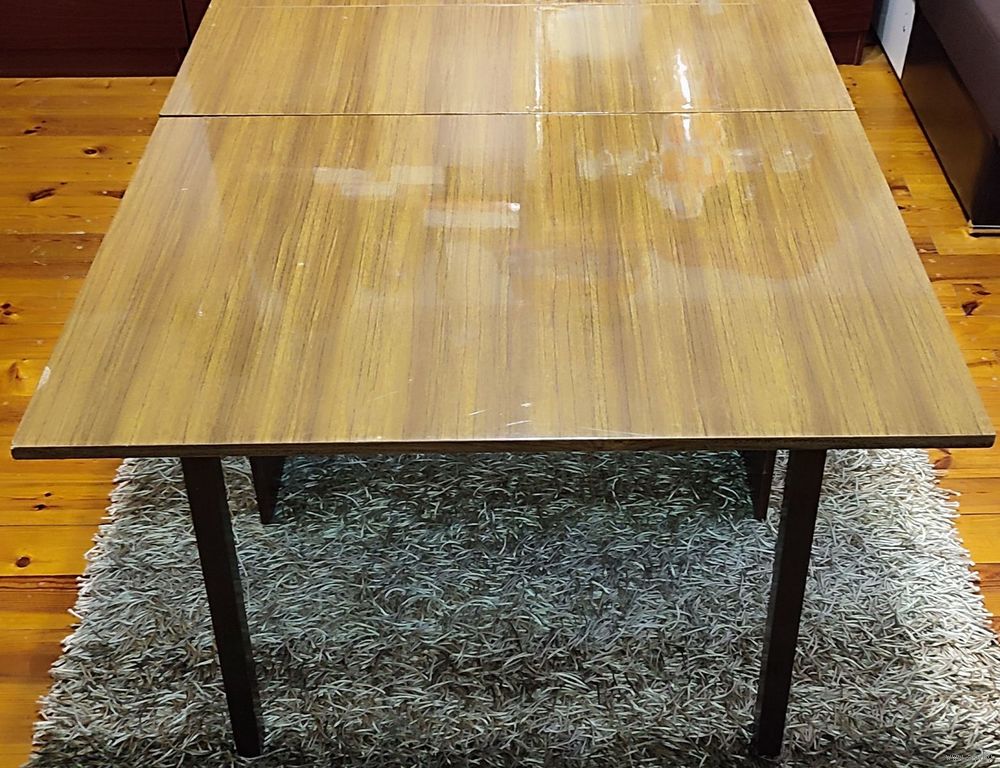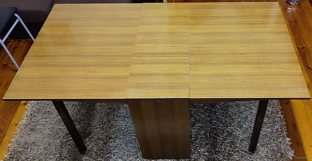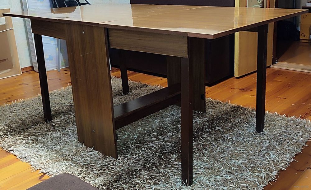 Лакированный стол-книга из времён СССР. До ужаса тяжеленный, с мелкими сколами-царапинами, но до сих пор достойно выполняющий свои функции: будь то званый ужин на 12 человек или игра в настольный теннис, а также, за счёт своих габаритов - любимое место маленьких детишек для игры в прятки во время застолья. Поддержка осуществляется двумя распашными "ножками" с каждой стороны