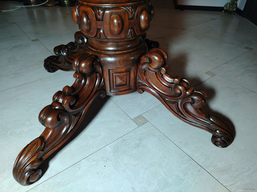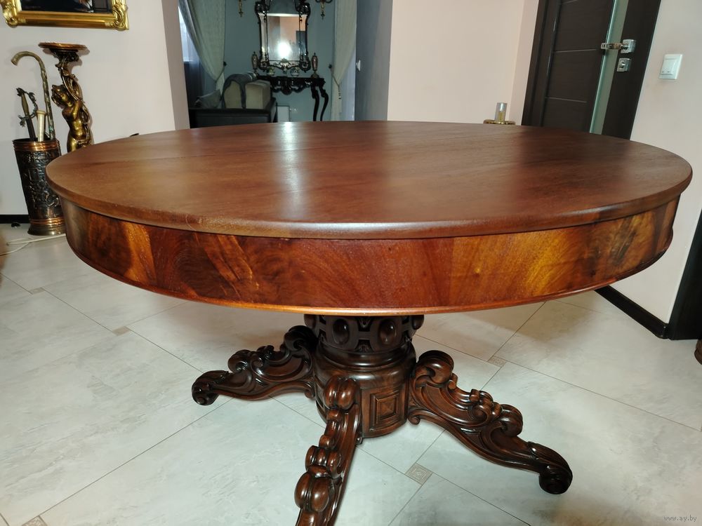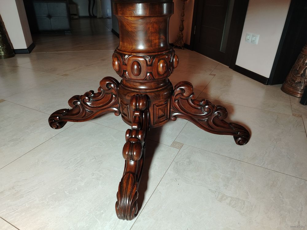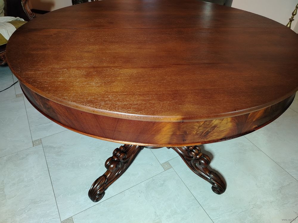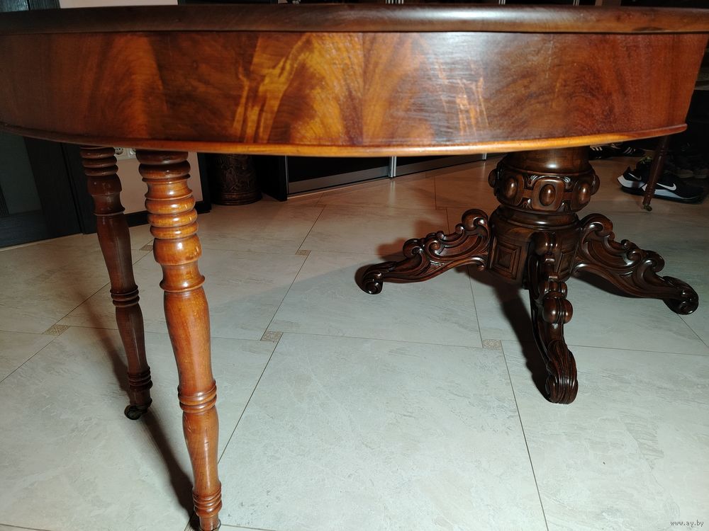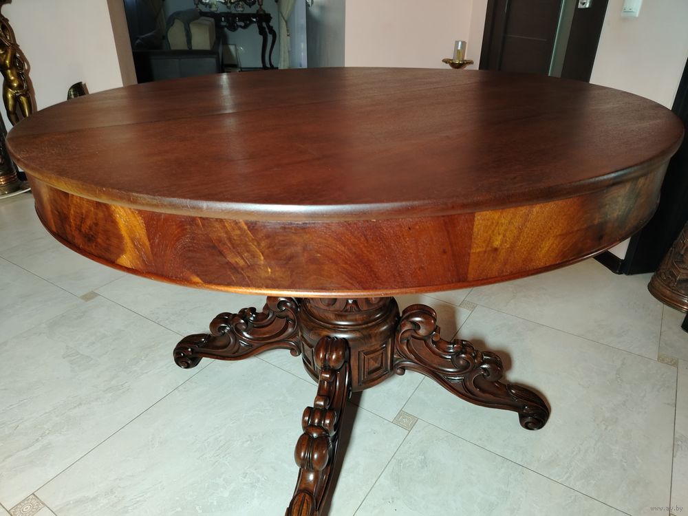 Старинный стол. Европа. Массив дерева с красивой резной ножкой. Стол раскладывается и имеет дополнительные ножки. Высота 78 см диаметр 100 см. В разложенном виде 100 см на 260 см можно и больше (механизм позволяет).