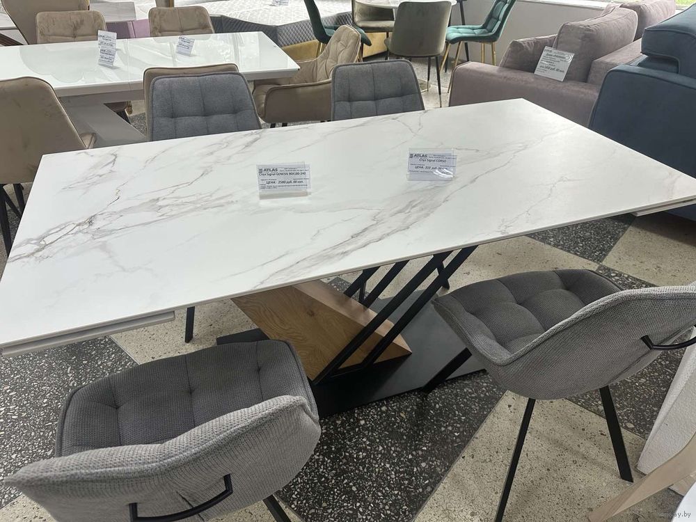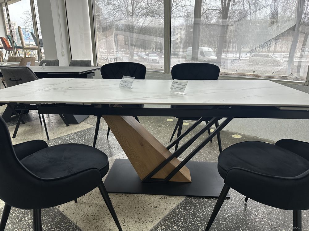 Стол обеденный, Размер 90х180, в разложенном виде 90х240, столешница керамика, цвет белый мрамор, нага черная. Новый. Доставка по Минску до подъезда бесплатно.