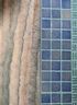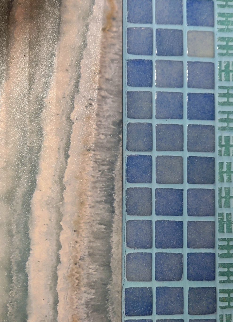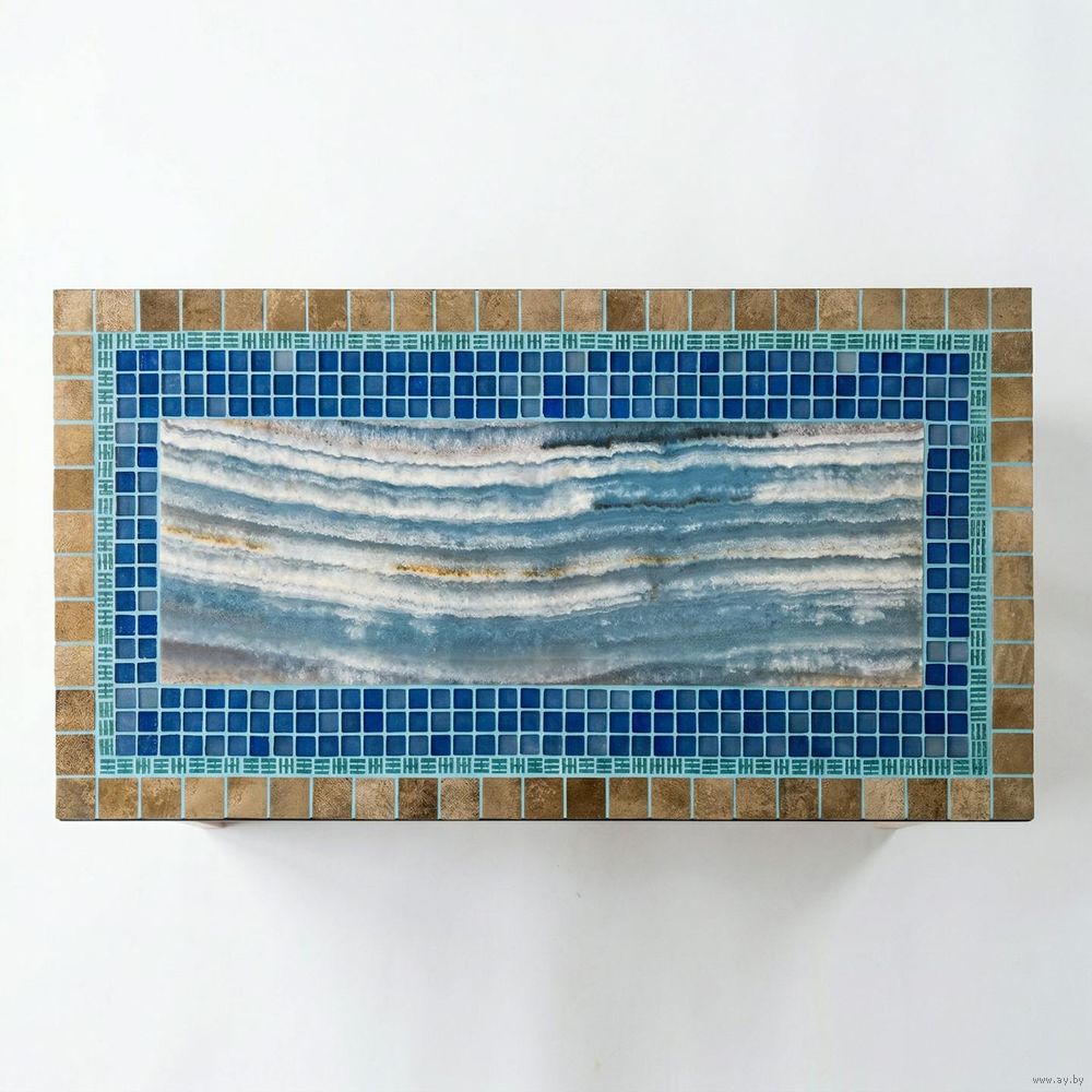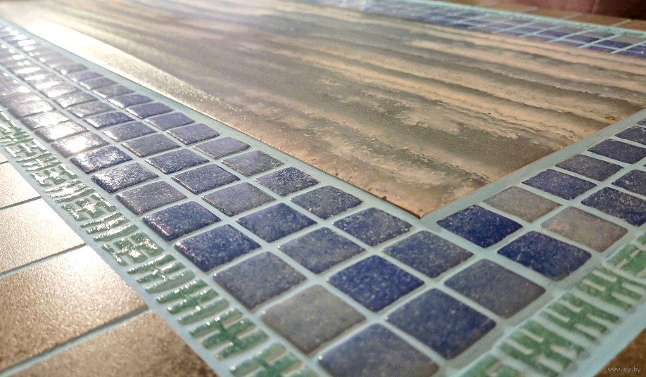 Инкрустирован импортной плиткой и мозаикой. В центре итальянская плитка с искрящимся напылением. Сделано надёжно и с любовью. Камера немного искажает гармоничные цвета.