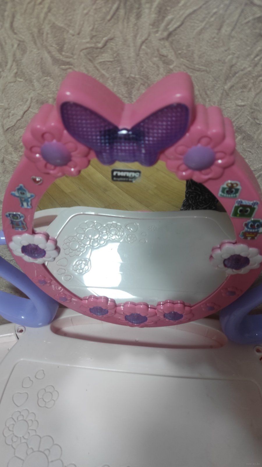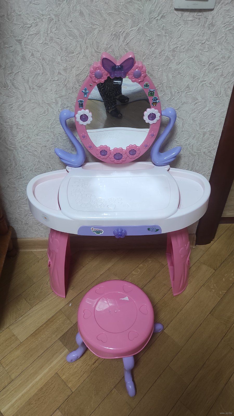 Столик для красоты, зеркало и стул. Очень милый набор, хорошее состояние. Есть еще крышечки для боковушек, но нет одного фиксатора (штырек), можно самим сделать, мы крышки не использовали. Нужно снять наклейки. Общий размер столика с зеркалом высота 75 см, ширина 49 см, разборный, могу выслать почтой по предоплате.