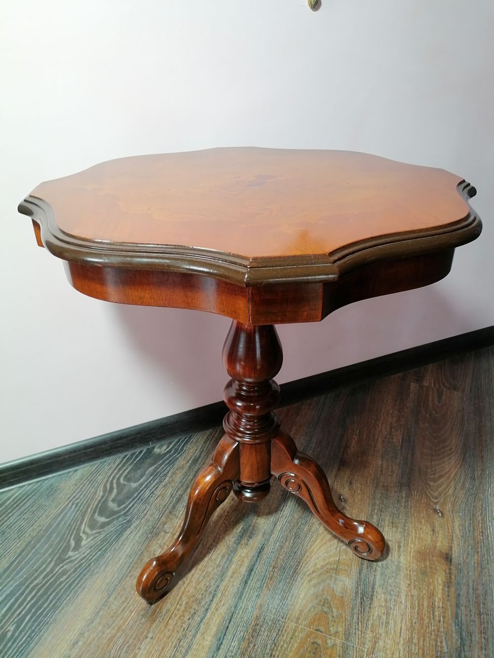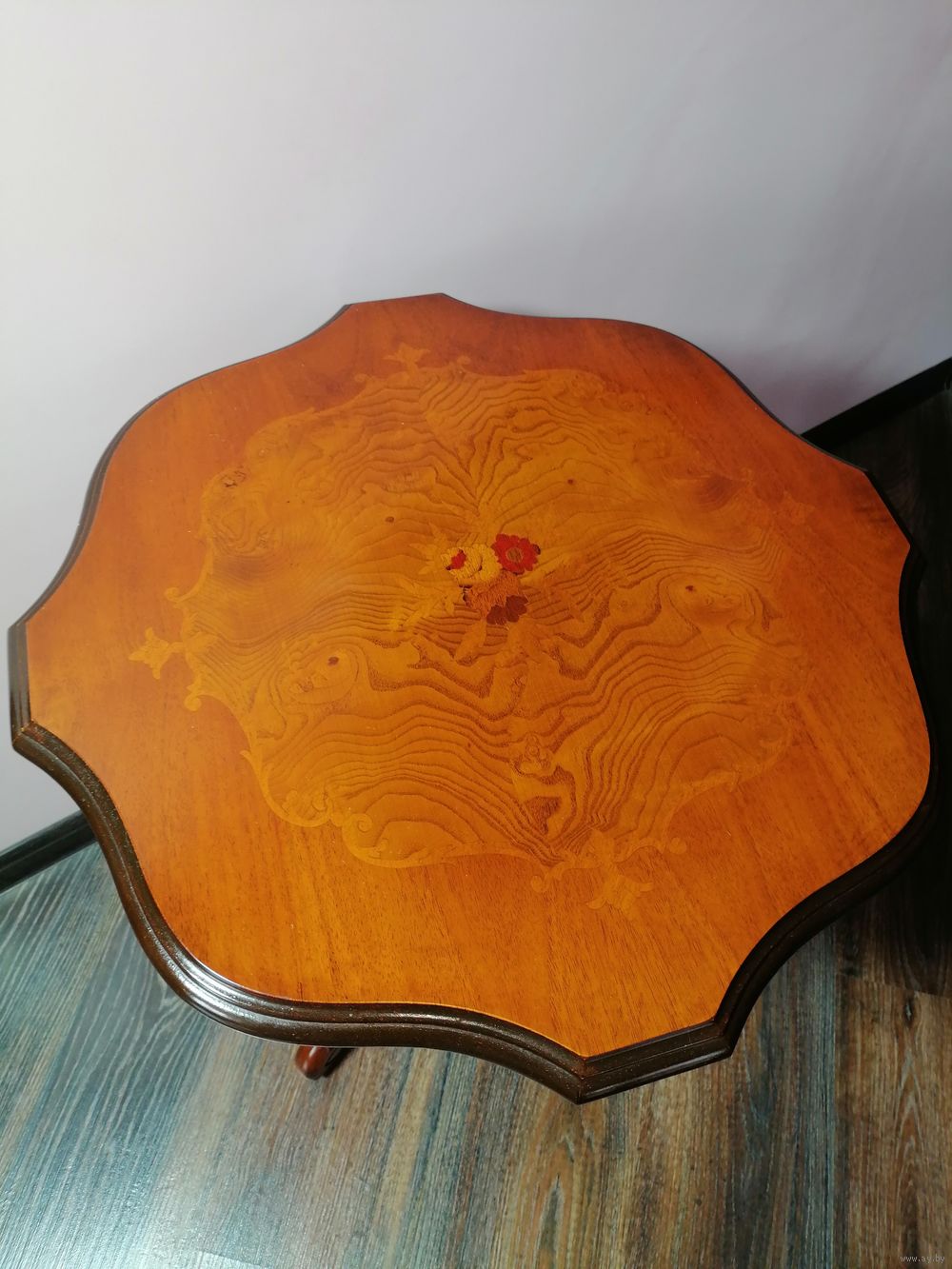 Прекрасный предмет мебели прошлых лет. Европа. Массив дерева, техника маркетри. Высота 62см диаметр столешницы 55см.