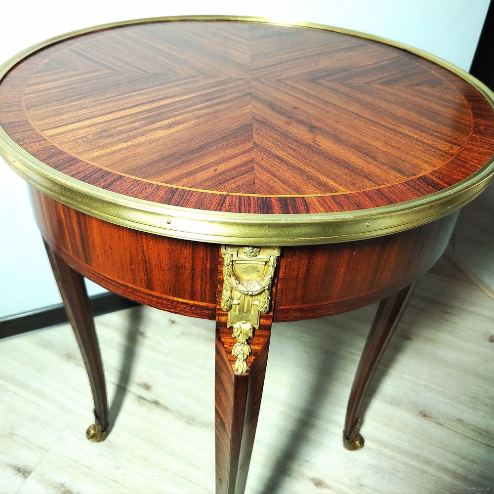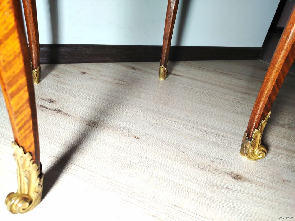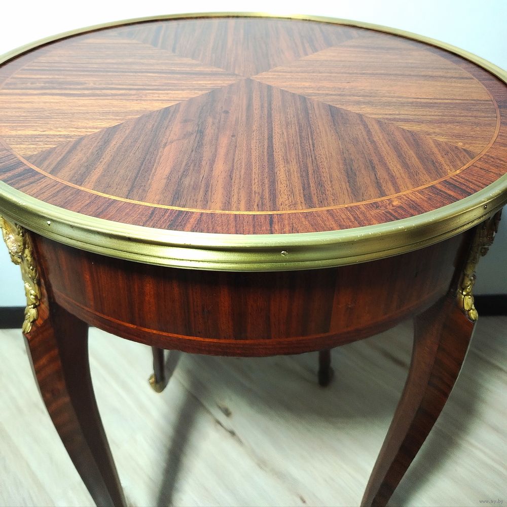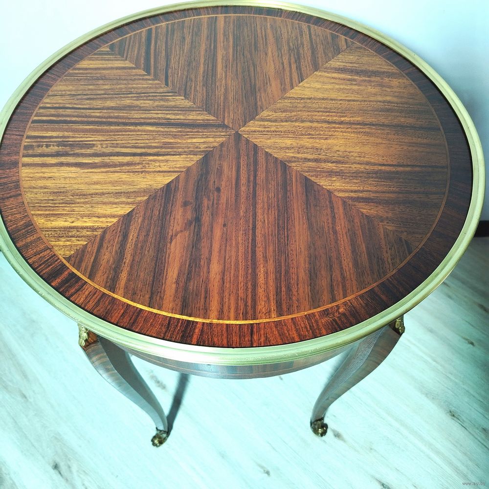 Прекрасный предмет мебели прошлых лет. Европа. Массив дерева, техника маркетри, бронзовые элементы. Высота 75см диаметр столешницы 55см.