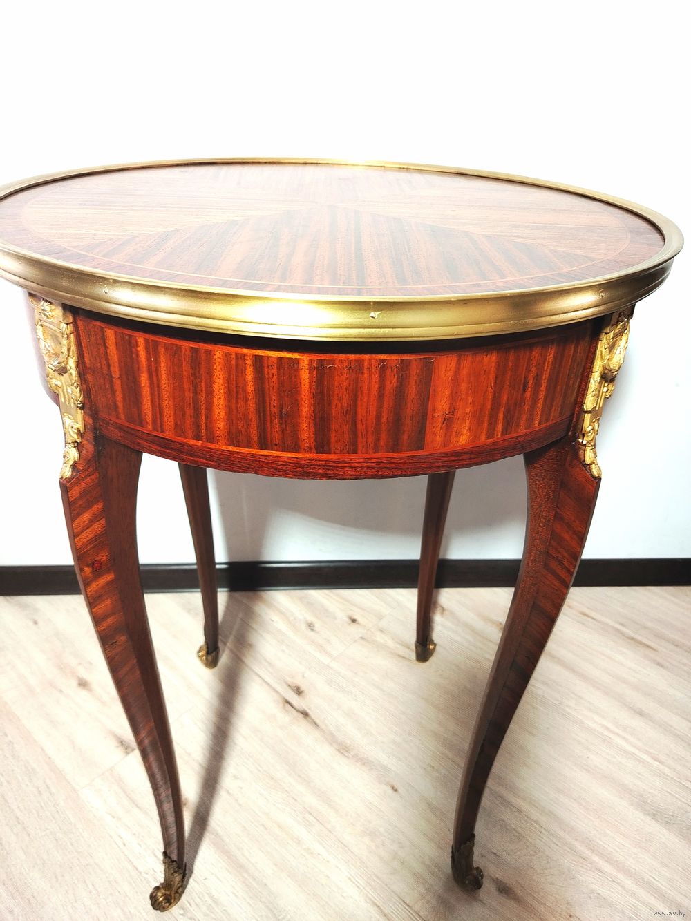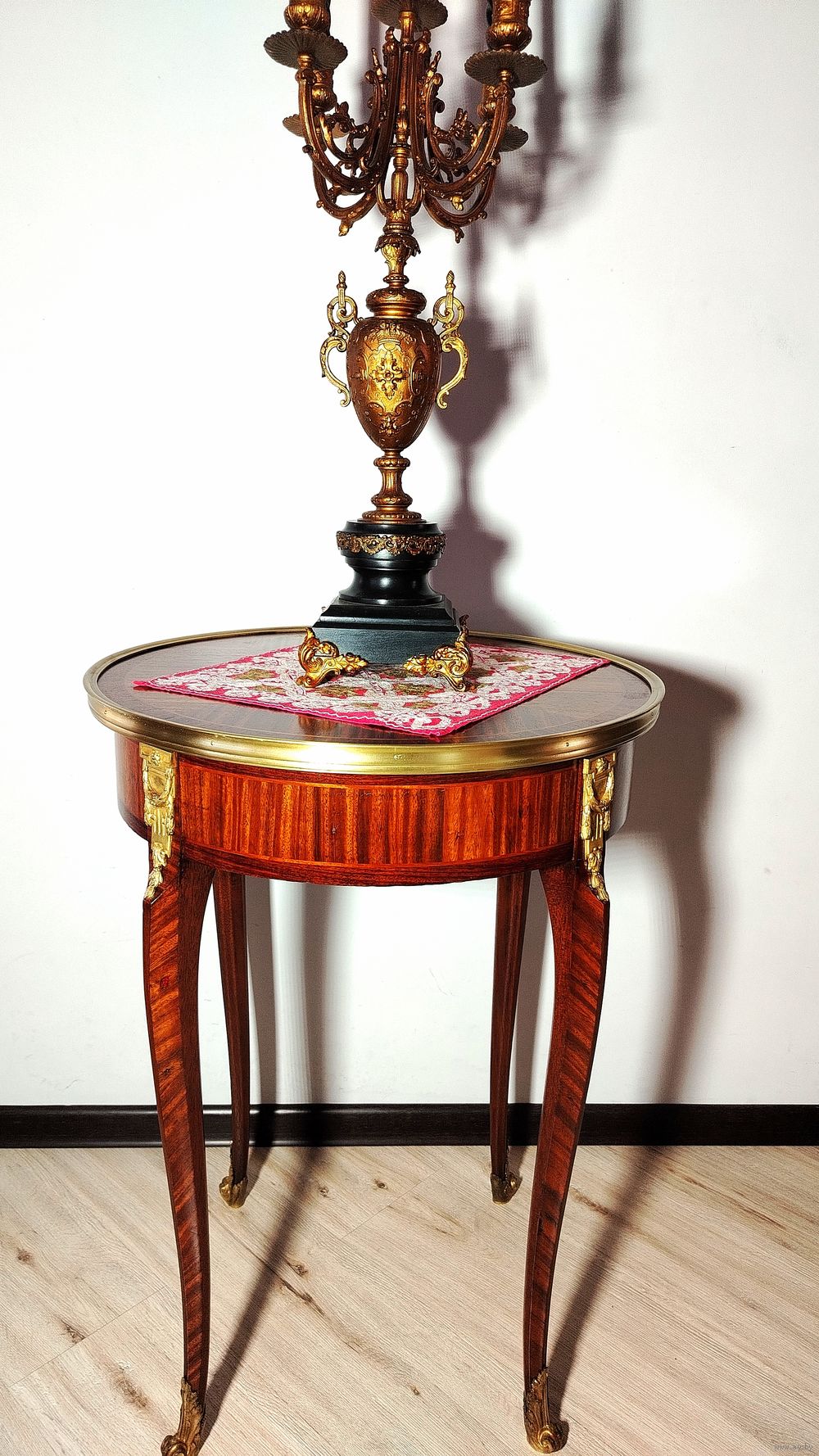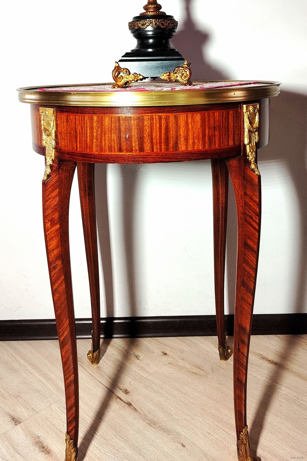 Прекрасный предмет мебели прошлых лет. Европа. Массив дерева, техника маркетри, бронзовые элементы. Высота 75см диаметр столешницы 55см.