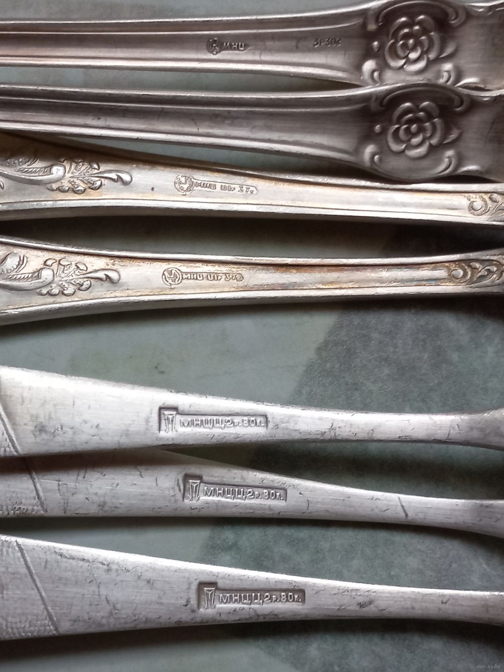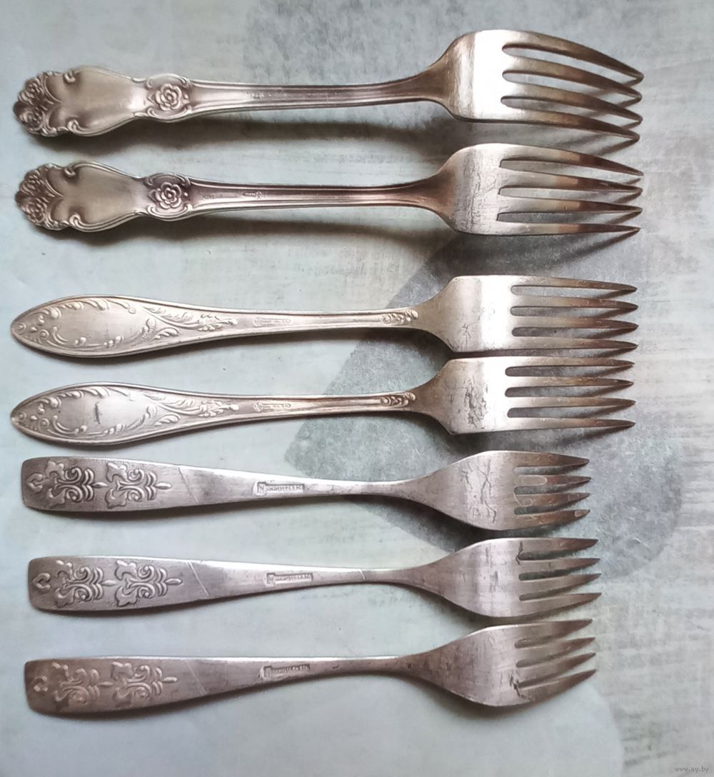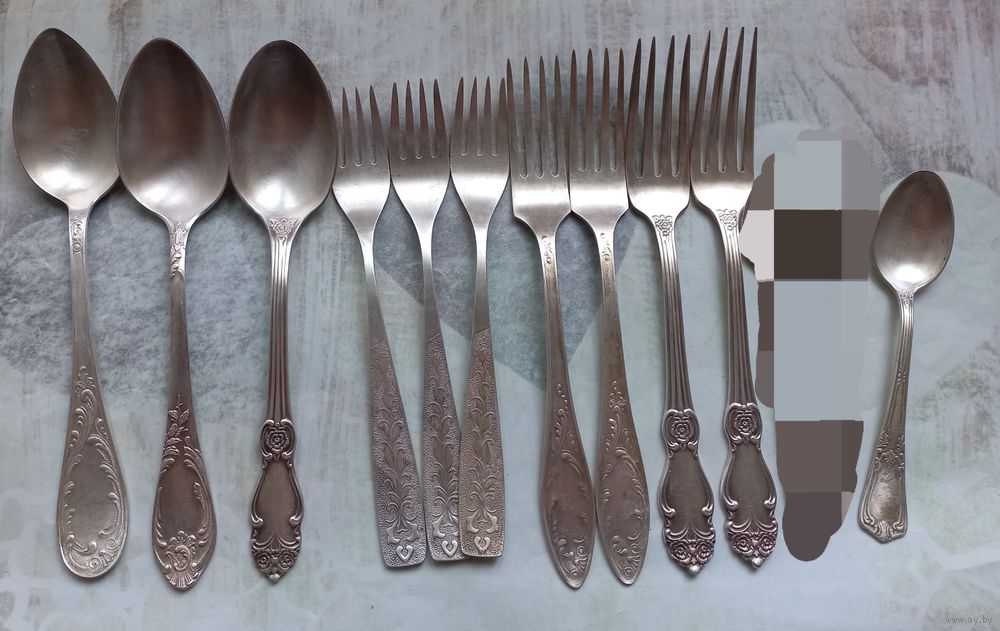 Столовые приборы из нейзильбера. МНЦ. 11 штук. 3 шт. большие ложки. 7шт. вилки. 1 шт. чайная ложка. Состояние на фото.