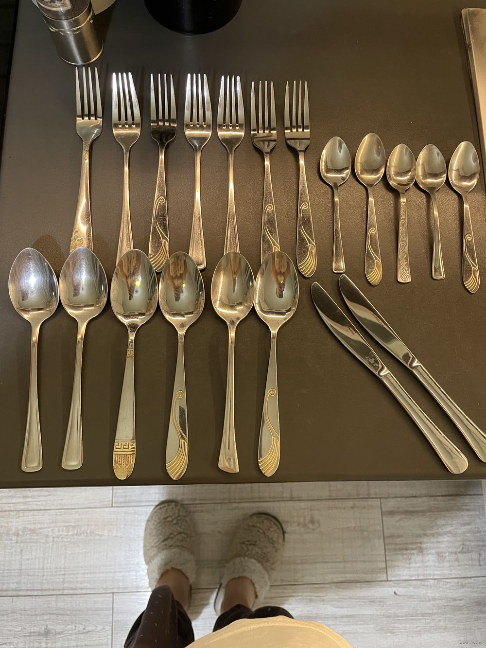 Продаю разномастные столовые приборы. Цена за все. 2 столовых ножа, 5 чайных ложек, 6 столовых ложек и 7 вилок. Следы использования есть, потому что они были в употреблении, без дефектов, хорошее состояние.