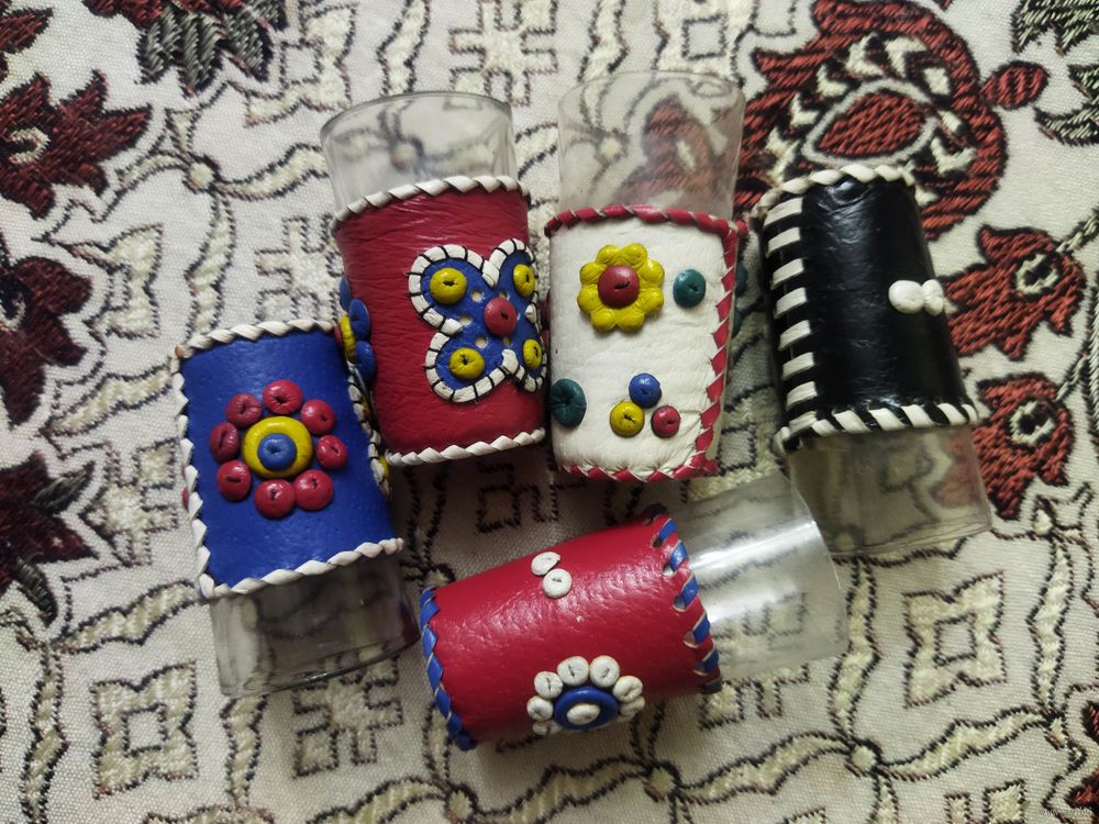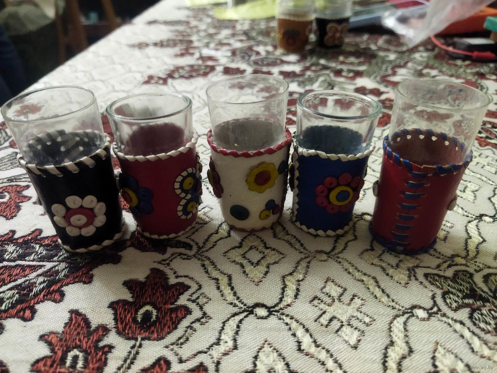 Стопки в кожаных чехлах в мексиканском стиле под текилу. Пять штук по 15 грамм