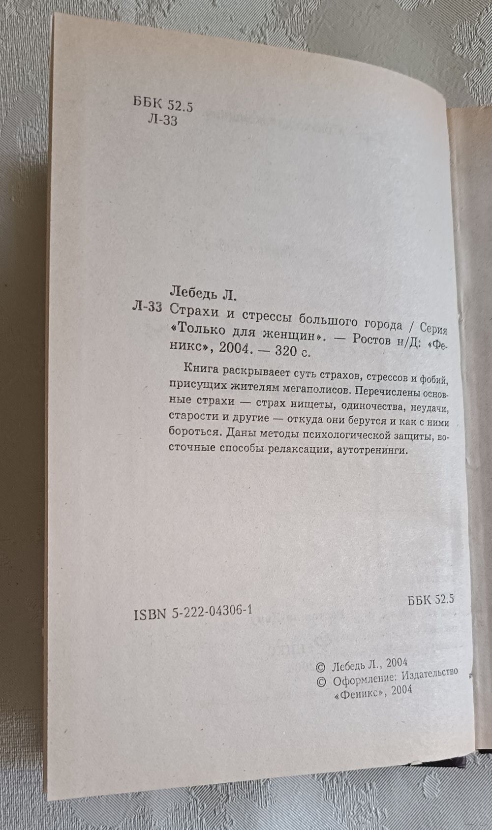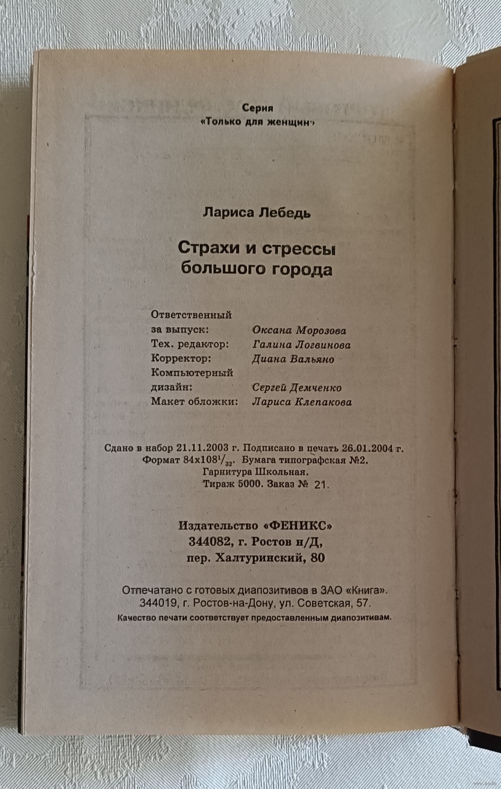 Лебедь Лариса. Страхи и стрессы большого города / Серия «Только для женщин». - Ростов н/Д Феникс, 2004. 320 с, твёрдая обложка.