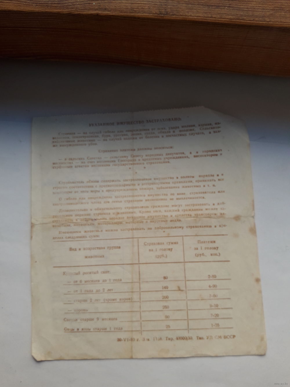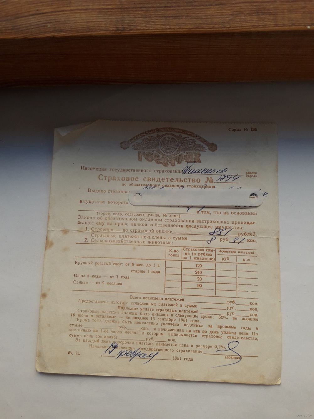Страховое свидетельство Госстрах БССР форма 136 (1981)