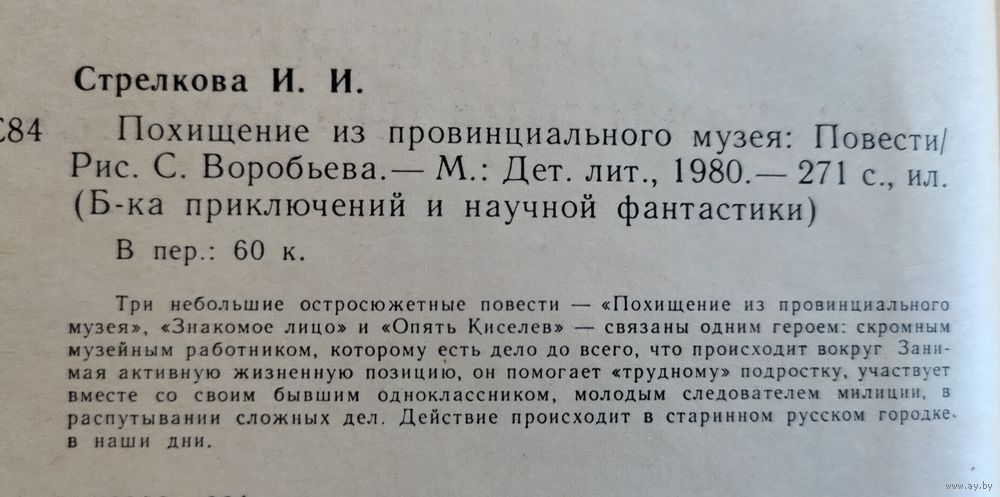 Стрелкова И. Похищение из провинциального музея. Серия: Библиотека приключений и научной фантастики (БПиНФ, рамка). Повести. Худ. С. Воробьев. М.: Детская литература, 1980г., 272 с. Твёрдый переплёт. Обычный формат.