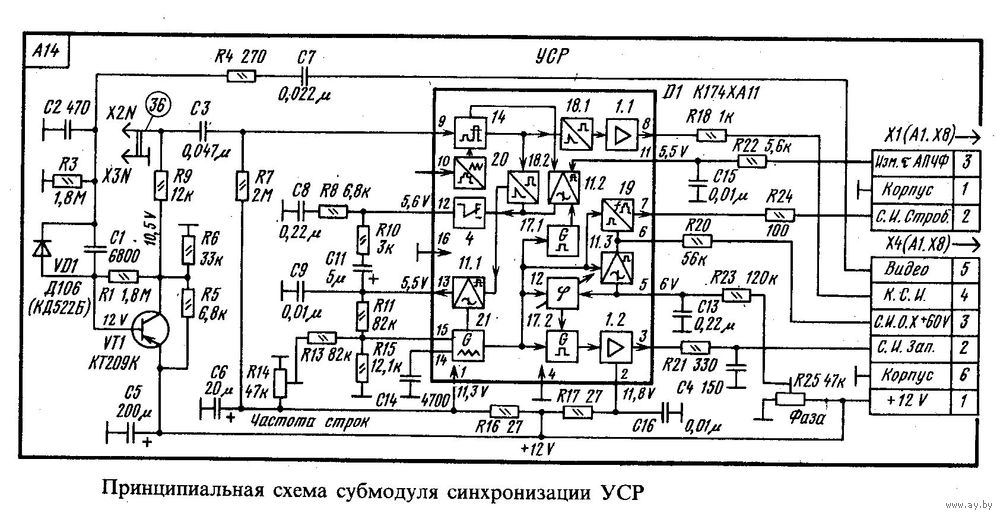 Выполняет функции амплитудного селектора синхроимпульсов, задающего генератора строчной развёртки с АПЧиФ, формирователя кадровых синхроимпульсов и стробирующих импульсов для модуля цветности.