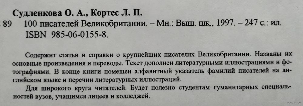 Судленкова О., Кортес Л. 100 писателей Великобритании. Минск: Вышэйшая школа, 1997г., 247с. Твёрдый переплёт, увеличенный формат (ISBN: 985-06-0155-8 / 9850601558)