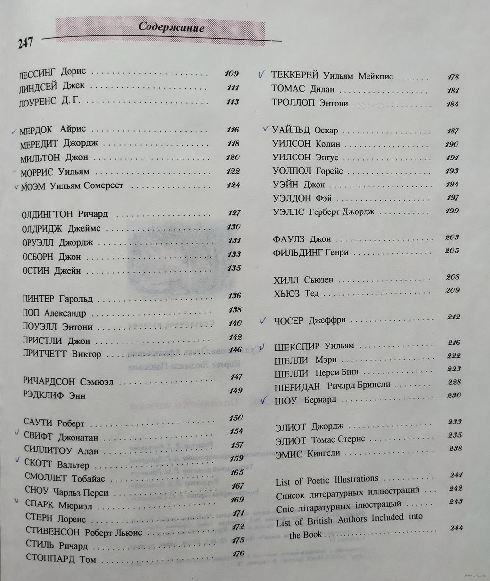 Книга содержит очерки о жизни и творчестве крупнейших писателей Великобритании, списки произведений с указанием года издания и их переводы на русский и белорусский языки. Текст дополнен литературными иллюстрациями и фотографиями. Помещены списки основных критических работ по творчеству писателей, вышедших на русском, белорусском и английском языках. В конце книги дан алфавитный указатель фамилий на английском языке и перечень литературных иллюстраций. Для широкого круга читателей: студентов, специалистов-филологов, библиотекарей, переводчиков, рядовых читателей - всех, интересующихся английской литературой.