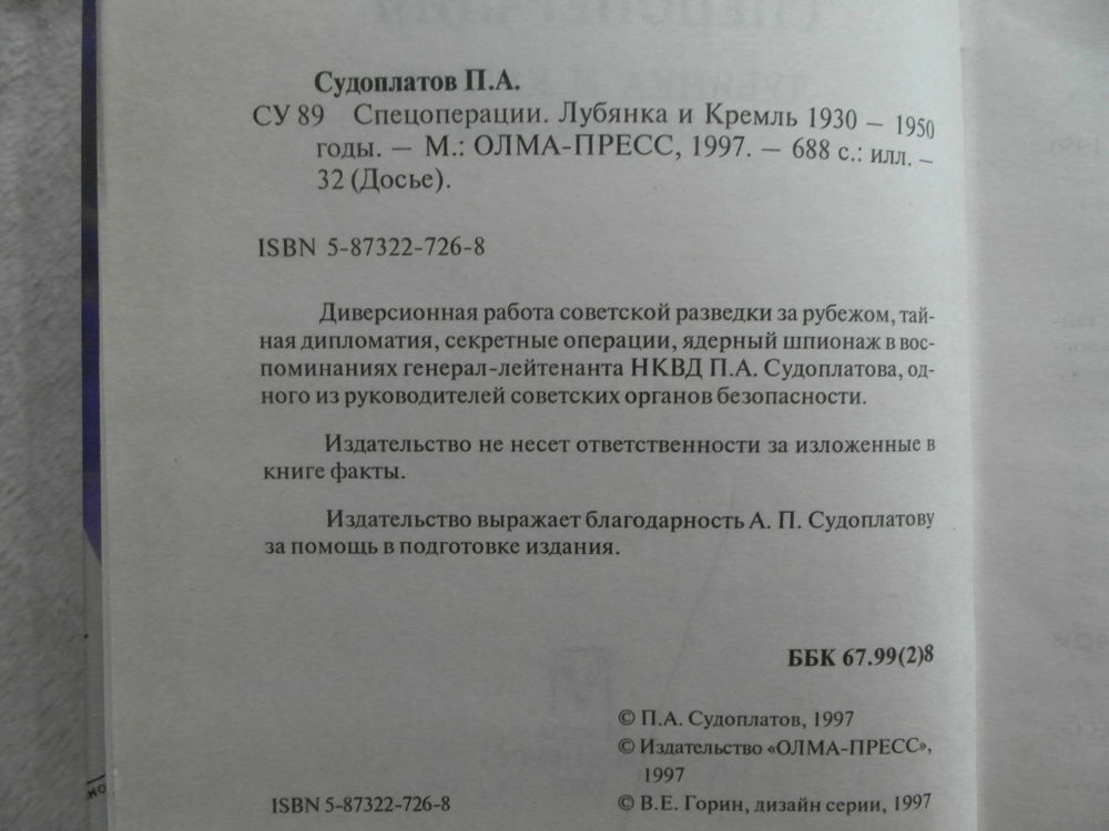 Диверсионная работа советской разведки за рубежом, тайная дипломатия, секретные операции, ядерный шпионаж в воспоминаниях генерал-лейтенанта НКВД П.А.Судоплатова, одного из руководителей советских органов безопасности.Павла Анатольевича Судоплатова уже при жизни считали асом шпионажа, а вернее сказать, гроссмейстером сталинской политической разведки. Личность эта - воистину легендарная, на счету у которой немало громких дел: спецоперации, организация боевой работы в тылу врага, обеспечение ценнейшей информацией наших ученых - атомщиков. Но судьба распорядилась таким образом, что имя Судоплатова, одного из талантливейших разведчиков - нелегалов, ставшего впоследствии генерал - лейтенантом, руководителем разведывательно - диверсионных и террористических спецслужб, на долгие годы было вычеркнуто из истории органов государственной безопасности нашего отечества. В 1953 году он был несправедливо арестован как `ближайший пособник Берии` и пятнадцать лет нес свой тяжкий крест в камере знаменитой Владимирки. Большое количество фотографий и фотокопий документов. Наиболее полное издание.