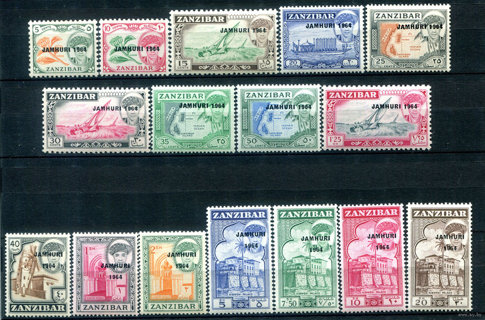 Султанат Занзибар - 1964г. - ландшафты, Сеид Джамшид ибн Абдулла, надпечатка JAMHURI 1964, разновидность шрифта - 16 марок - полная серия, MNH [Mi 281-296]. #4-B5-106-A-1