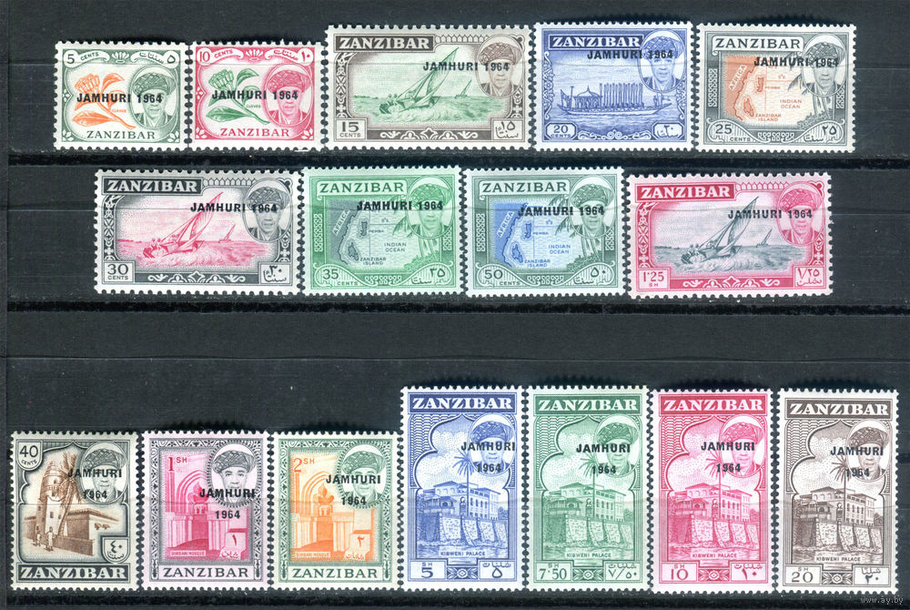 ![Султанат Занзибар - 1964г. - ландшафты, Сеид Джамшид ибн Абдулла, надпечатка JAMHURI 1964, разновидность шрифта - 16 марок - полная серия, MNH [Mi 281-296]. #4-B5-112-A-2](https://s1-lot.aystatic.by/550x510/181/475/5040/5040475181_0.jpg)