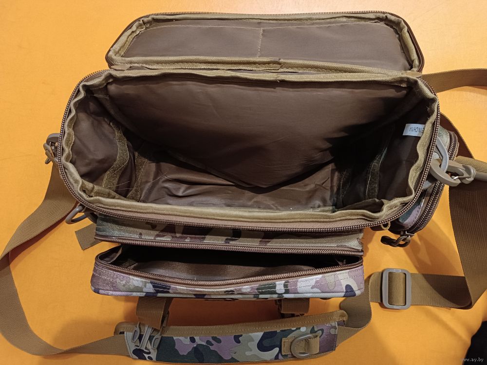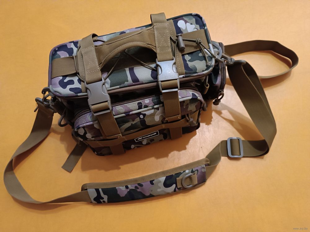 Сумка для приманок Nisus. Абсолютно новая (хранилась дома). Размеры 40 х 21 х 15 см. Ремень через плечо и поясной. В основной отдел входят две стандартные коробки размером 30х13,5х4 см, или 27,5х19х5 см (Shimano или Plano). Множество дополнительных карманчиков снаружи и внутри для мелочей и инструментов. Крепкие замки. 50 руб.