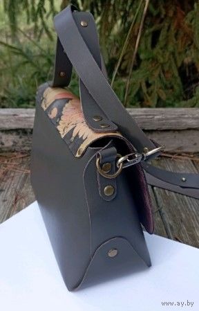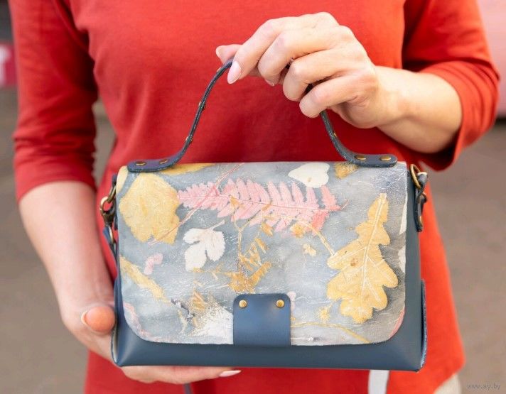 Цветная кожа КРС белорусского производства выделки, но окрашена вручную растениями в технике эко-принт, пропитка пчелиным воском с маслами и покрыта аппретурой от намокания.