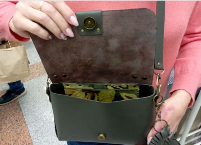 Сумка очень лёгкая, но при этом достаточно вместительная (классическое портмоне, телефон, очки в футляре и т.д.).