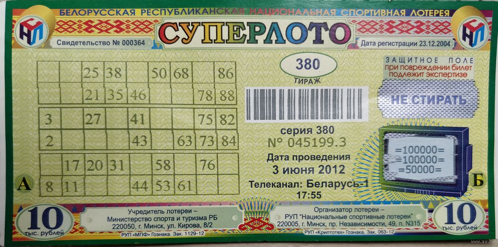 Билет лотереи Суперлото 380 тираж 3.06.Пересылка около 60 коп.