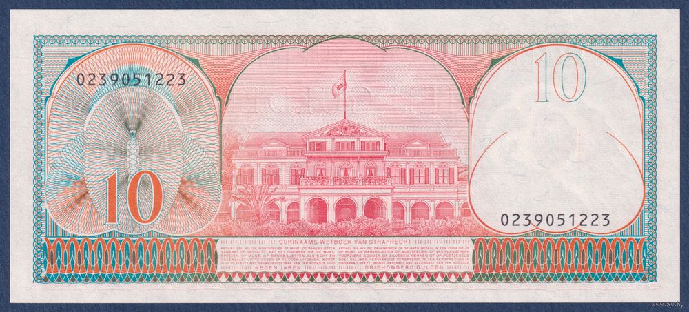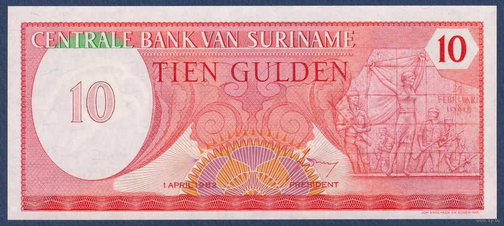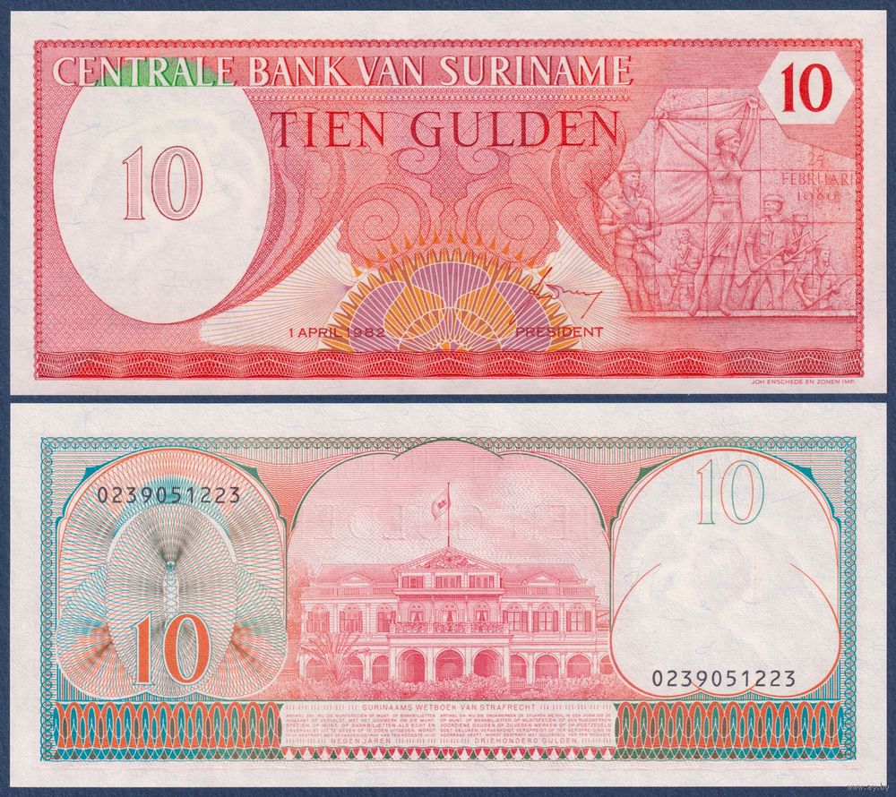Суринам, 10 гульденов 1982 г., P-126 (памятник восстанию,президентский дворец в Парамарибо), UNC