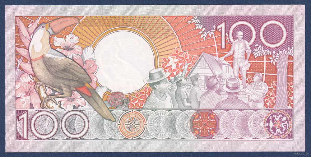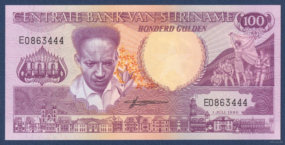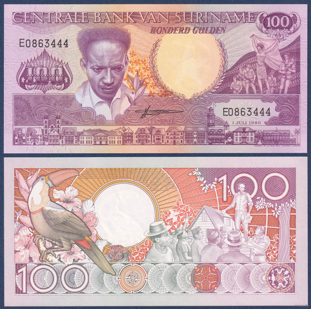 Суринам, 100 гульденов 1986 г., P-133a (E, революционер Антон де Ком), UNC