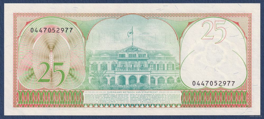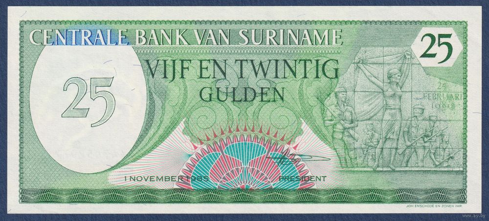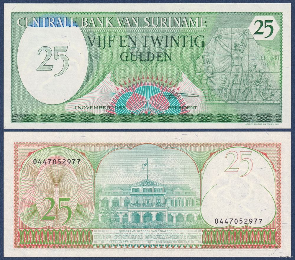 Суринам, 25 гульденов 1985 г., P-127b (памятник восстанию,президентский дворец в Парамарибо), UNC